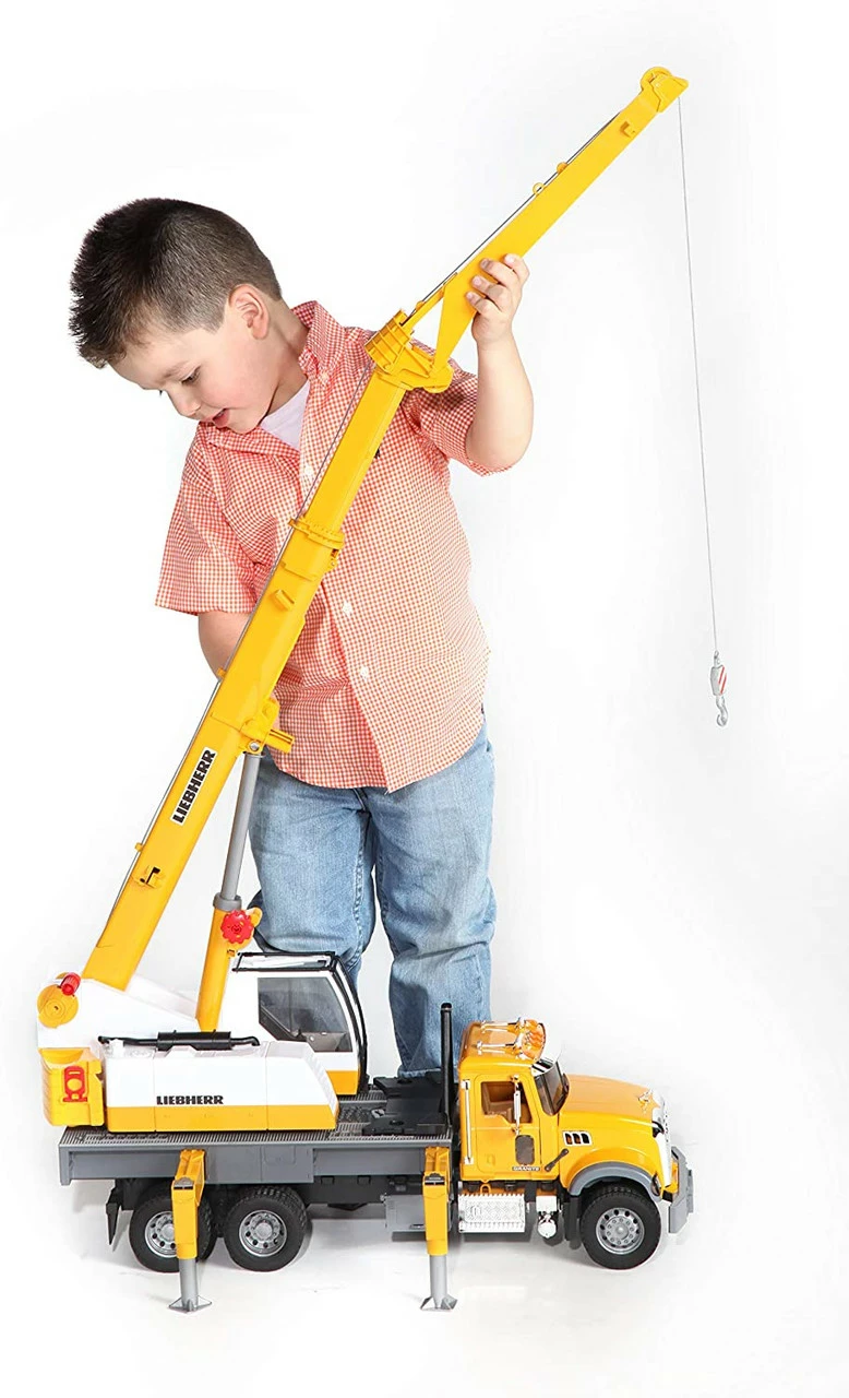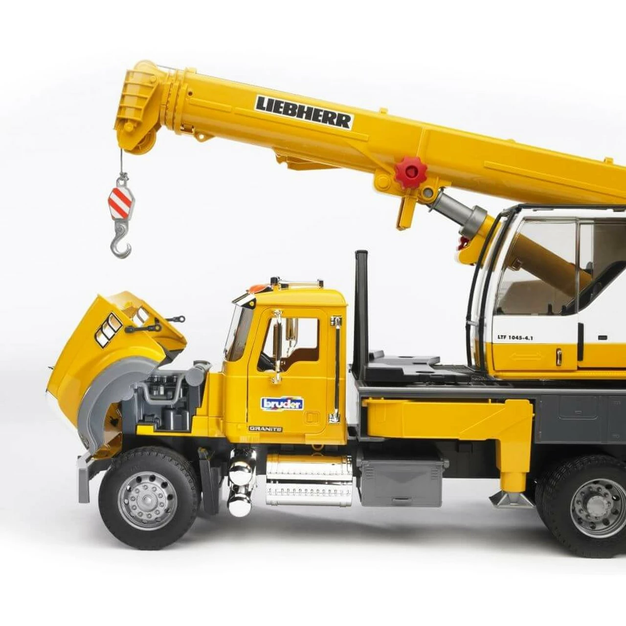 Bruders love of detail extends to the crane operator’s cab too. Just like the original, it has a pane protection frame and a sliding door which opens. A tool compartment integrated into the platform completes the many functions of the crane. The Mack cab is just as impressive. A truck with many functions like the bonnet and doors which open.