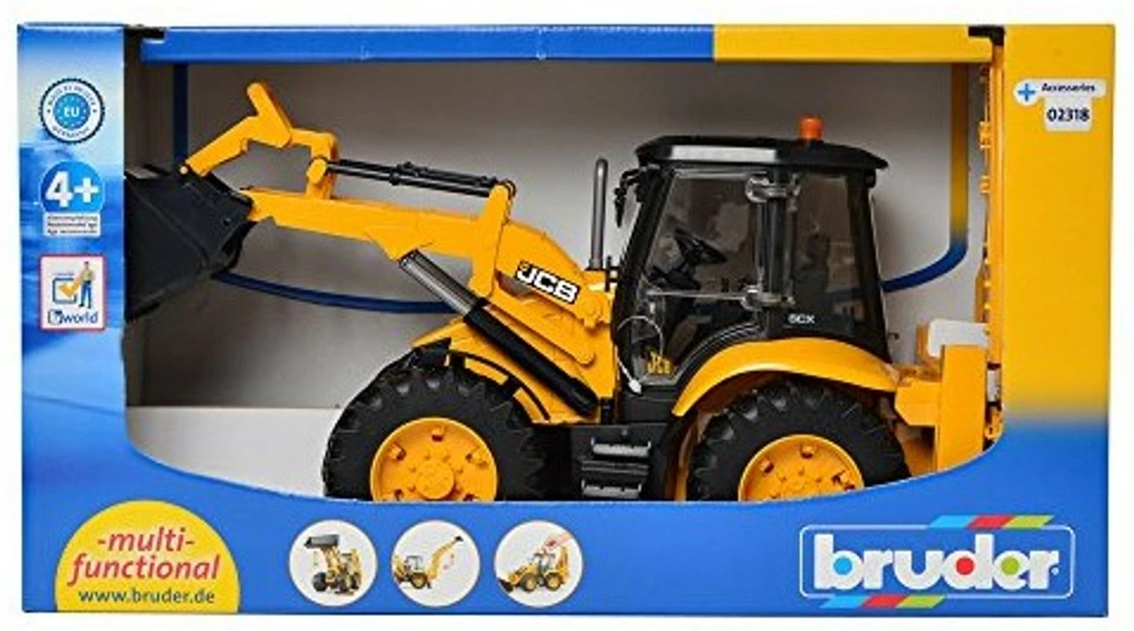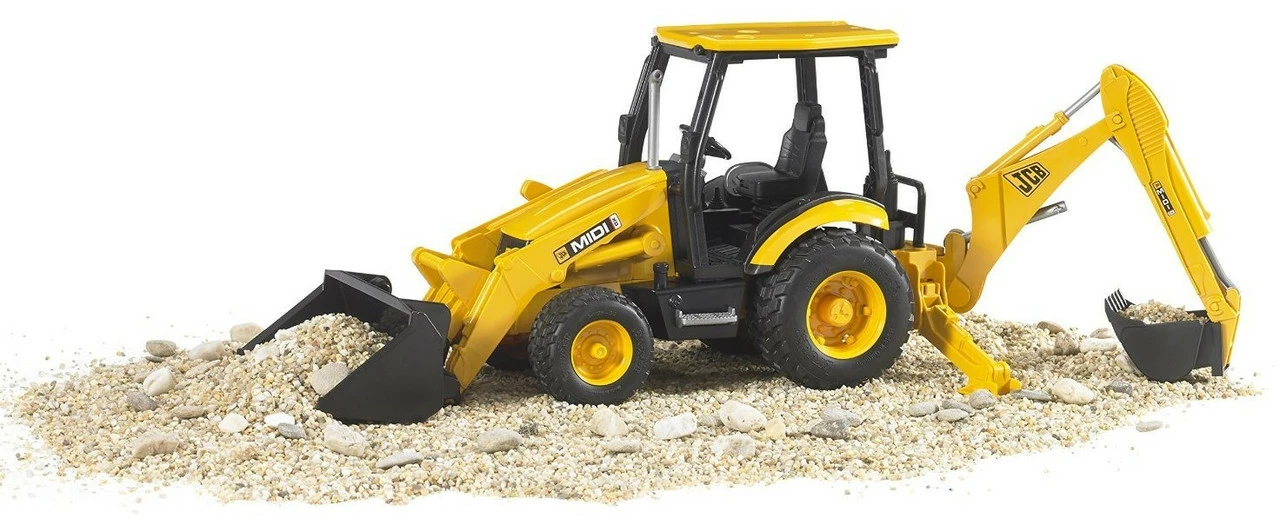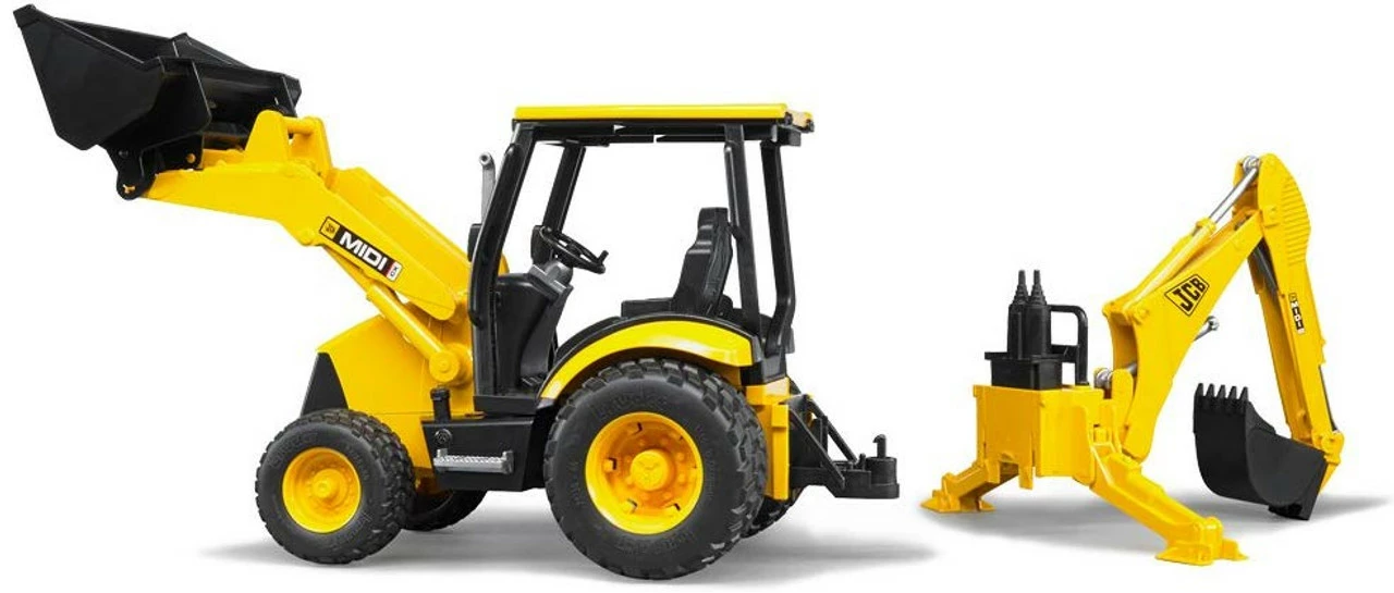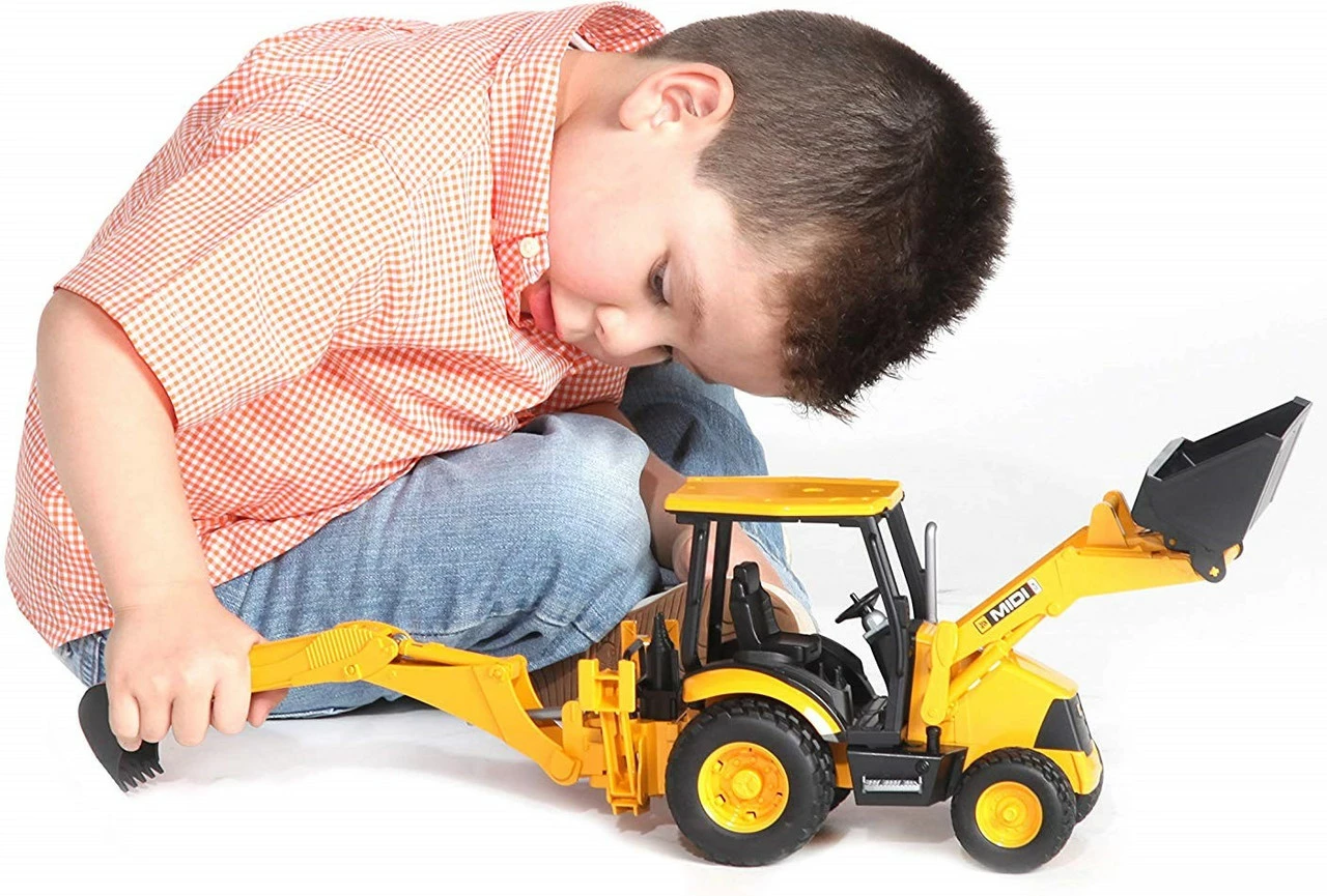 This JCB MIDI CX Backhoe Loader is made just like the real thing. The frontloading arm has a grip for steering and a locking mechanism in the upper position. The frontloading shovel has 2 positions for loading and unloading. The driver’s seat swivels to allow for the operation of the backhoe. The backhoe has fold-down support legs and is also detachable. The backhoe loading arm is able to excavate below ground level and the scoop steering can be operated using one hand. The front loader and backhoe loader scoops are both changeable. The standard tractor coupling, which is included, can be mounted when the backhoe loading unit has been removed; this allows all trailers and farming equipment available to be used. The soft rubber tires have real treads.