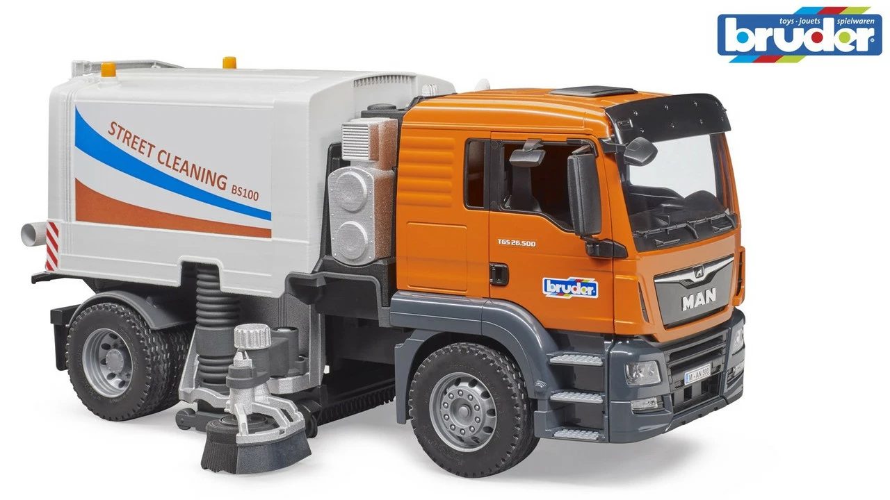 Road cleaning crews are an indispensable help for any municipality and form part of our everyday cityscape. No other vehicle can guarantee clean roads and pavements so effectively. BRUDER’s new road cleaning vehicle illustrates in great detail how this exciting truck works. The MAN TGS is the perfect partner. Thanks to durable design, featuring powerful engines of up to 500 hp and providing an above-average payload, this lorry is the prototype of the frequently described all-round vehicle.