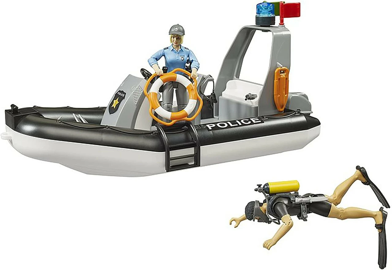 - Two bworld figures complete this comprehensive set. While the police officer is assigned to control the police boat, the fully equipped police diver takes care of the operations in the water.