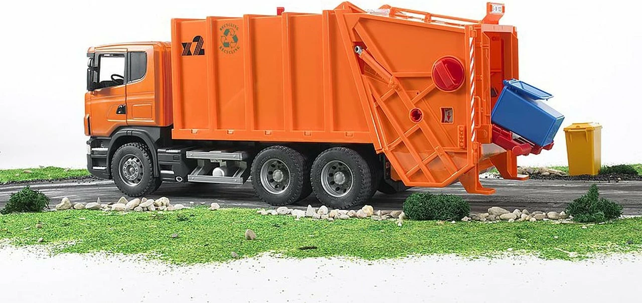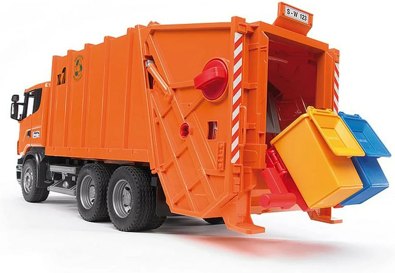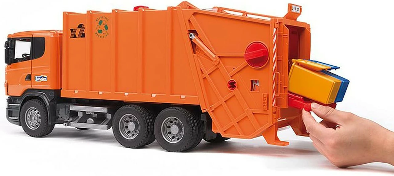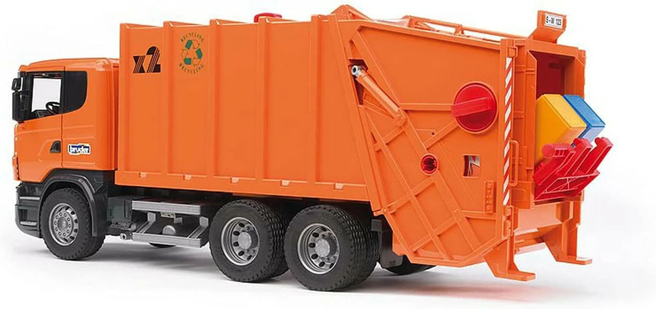 - From the Manufacturer; It’s time to take out the trash with the Scania Rear Loading Garbage Truck (Orange) #03560 by BRUDER!