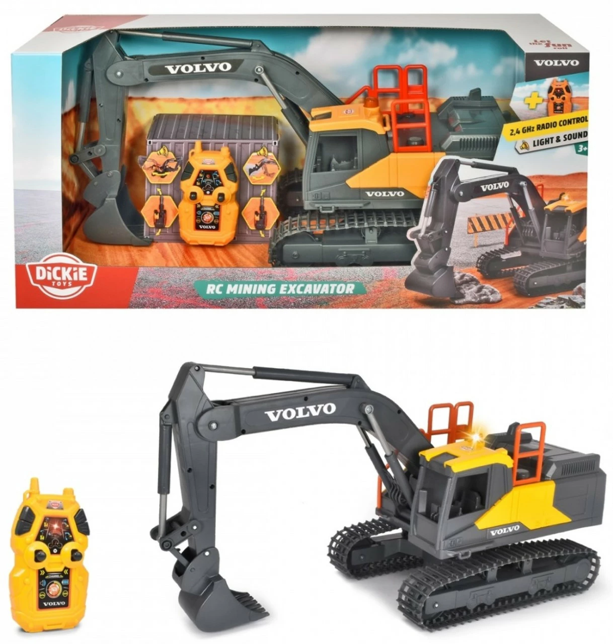- Action-packed digging fun for young truck drivers! No construction site would be complete without an excavator. The RC Volvo Mining Excavator from Dickie Toys is guaranteed to make building dreams come true. In addition to bright colours, the vehicle also features a large shovel that has plenty of room for transporting small stones, cuddly toys and other objects.