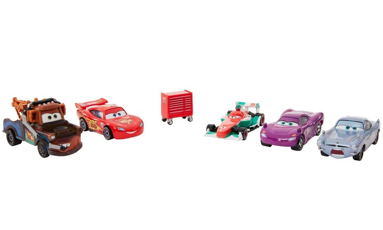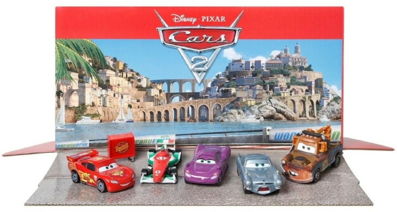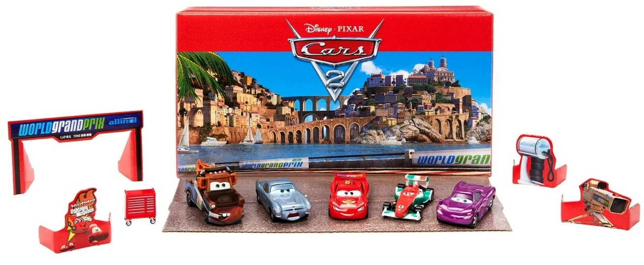 It’s an instant Disney and Pixar Cars 2 collection with five character cars in one set that celebrates the second Cars movie. Fans will love unboxing the package to reveal a fold-out scene and perforated storytelling pieces inspired by the World Grand Prix in Porto Corsa, Italy. Lightning McQueen, Pit Crew Chief Mater, Holley Shiftwell, Finn McMissile and Francesco Bernoulli are ready to race right out of the box into play or display. Recreate moments from the film or create new memories — kids and collectors will love bringing Cars 2 to life. With lots of fan-favourite elements, this Disney and Pixar Cars 2 five-pack set makes a great gift for fans of the film ages 3 years old and up. Colours and decorations may vary. Key Features: Disney and Pixar Cars fans will love this 5-car storytelling pack inspired by Cars 2! Unbox the package and reveal the fold-out scene of the Porto Corsa, Italy leg of the World Grand Prix that includes perforated storytelling pieces, like a gas pump and welcome sign! Use the packaging along with the 5 character vehicles for play or display — the set comes with Lightning McQueen, Mater, Francesco Bernoulli, Finn McMissile and Holley Shiftwell racers! With an added die-cast tool cart, Cars fans will have a blast recreating favourite movie scenes and inventing new adventures! The instant collection of fan-favourite vehicles makes a great gift for collectors and kids ages 3 years old and up!