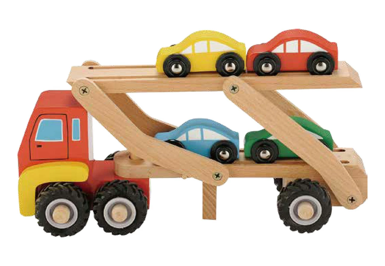 Your little one can play all day with this quality wooden transporter truck and 4 coloured cars. Designed to: