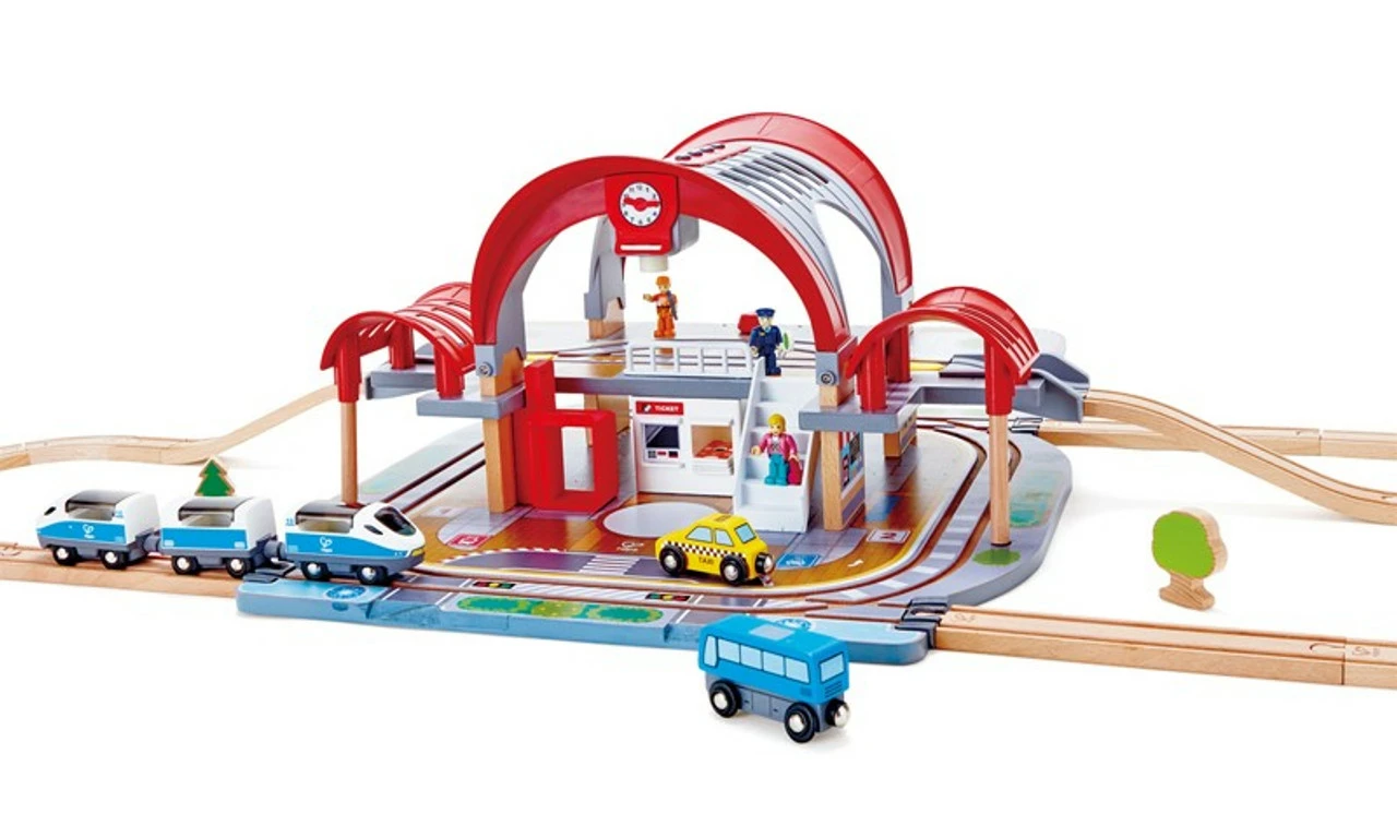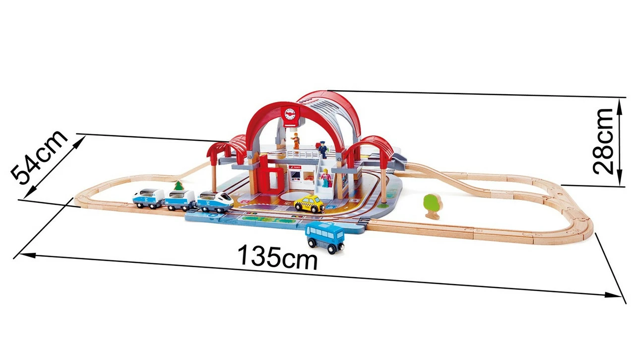 All aboard! This two-level station kit lets you experience all the thrills of a big city railway. Make your passenger buy a ticket, ride the lift and rush to catch the fast train. Includes recorder for station announcements, destination projector and light.
