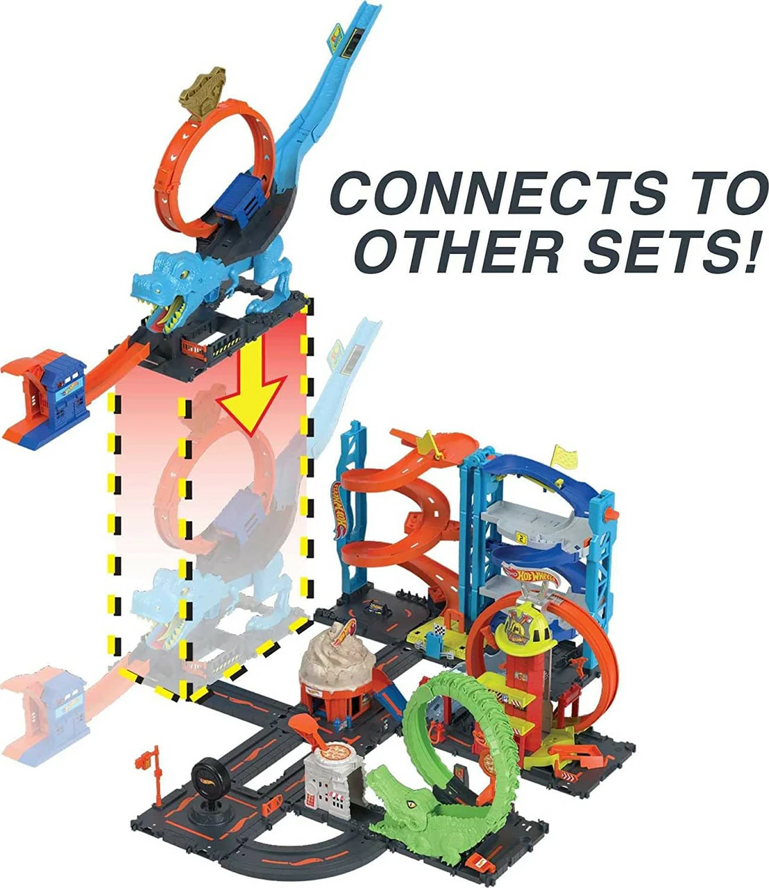 - Race through the mouth of a massive T-Rex who’s trying to eat Hot Wheels City. Time it just right to knock the dinosaur out and save the day!