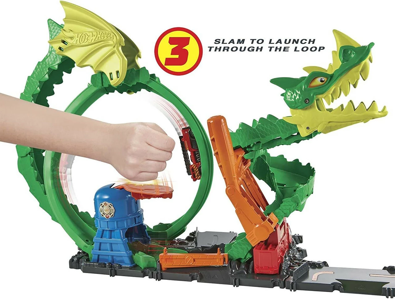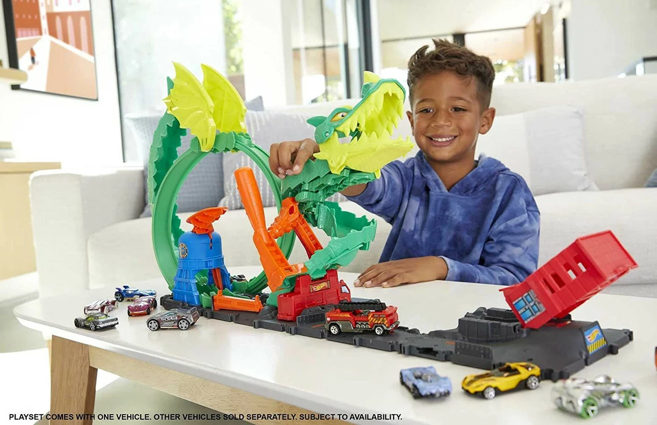 - Save Hot Wheels City from vicious dragon attacks in the Hot Wheels City Dragon Drive Firefight Playset.