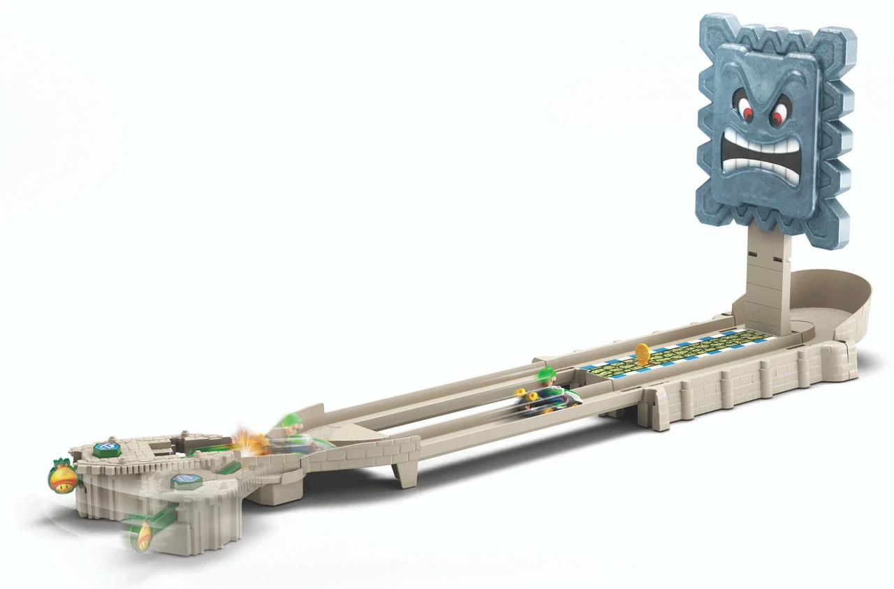 - Hot Wheels® Mario Kart™ Track Set Assortment 4 different tracks with Mario Kart™ vehicles and nemesis from video game 11 Total 1- Slam Launcher 2- Track piece 3- Diverter Track 4- Thwomp land mass 5- Thwomp 6- Bank turn 7- Large bank a 8- Large bank b 9- Large bank c 10- large bank support 11- Kart