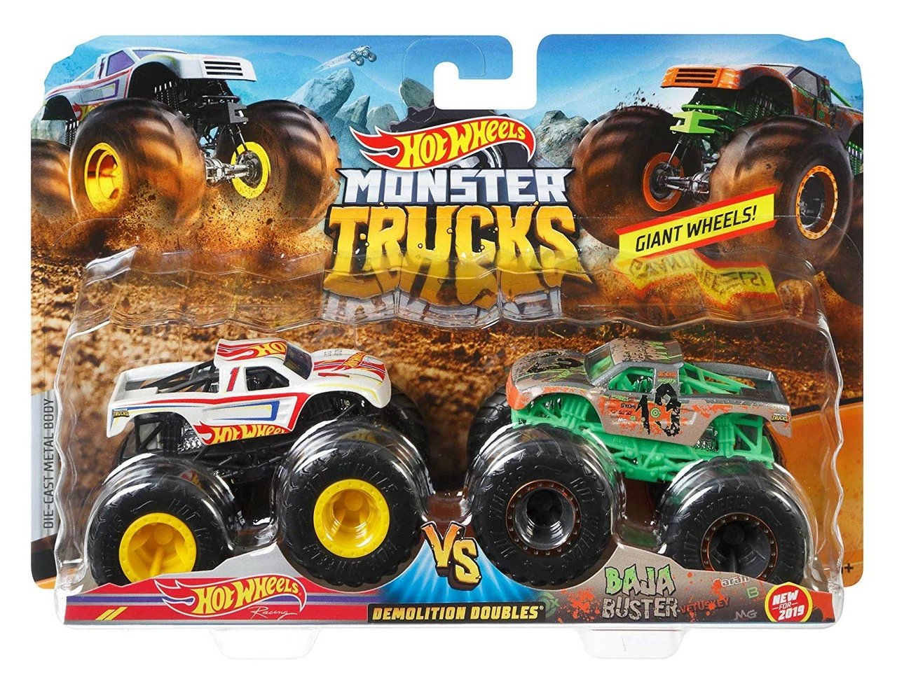 The Hot Wheels Monster Trucks 1:64 Scale Demolition Doubles trucks stand by to smash their arch-rivals! These two packs of Monster Trucks squaring off for epic crash attacks are purposely paired for head-to-head battles with their GIANT wheels and big personalities! Every package includes two opponents, and the package provides stats for each, including name, truck type, strength, unique crash attack, and motor-vation, for great storytelling fun! Each is sold separately, subject to availability. Colours and decorations may vary.