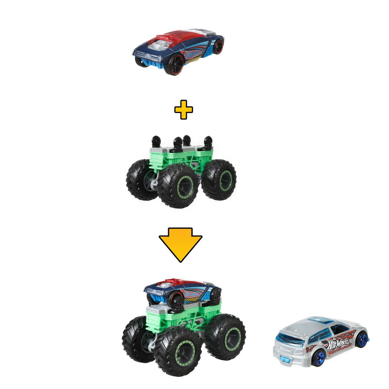 Kids can transform their Hot Wheels® cars into Monster Trucks with the revolutionary Monster Maker! Hot Wheels® integrates Monster Trucks and 1:64 scale Hot Wheels® cars to deliver an entirely new way to play. This assortment has five different coloured truck chassis and each chassis comes with 2 complementary Hot Wheels® vehicles to mix and match. Most Hot Wheels® cars can fit the Monster Truck chassis so kids can play with their existing collection and multiply their creations! Lots of kids have buckets of Hot Wheels® cars at home and now they can expand the inter-PLAY of Hot Wheels® Monster Trucks and Hot Wheels® cars for hours of creative play! Each coloured truck chassis comes with 2 Hot Wheels® cars with exclusive decos.