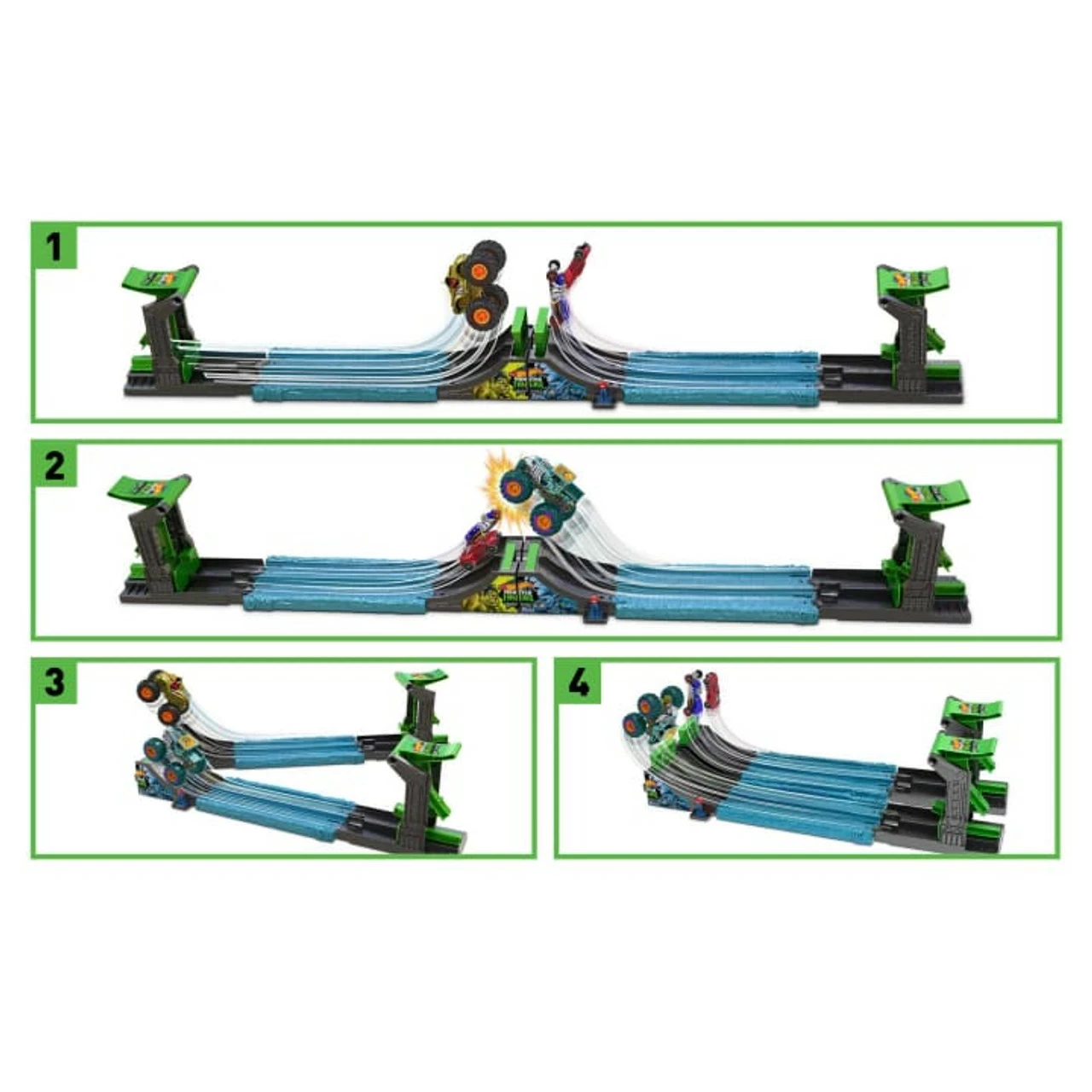 - With 4 vehicles—2 monster trucks and 2 1:64 scale cars—the Hot Wheels® Monster Trucks Roarin’ Rumble™ playset gets the action rumbling right out of the box!