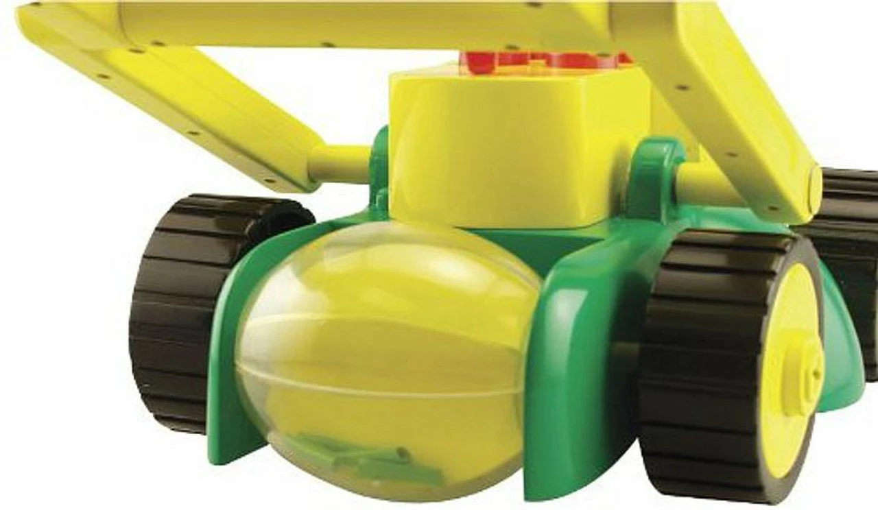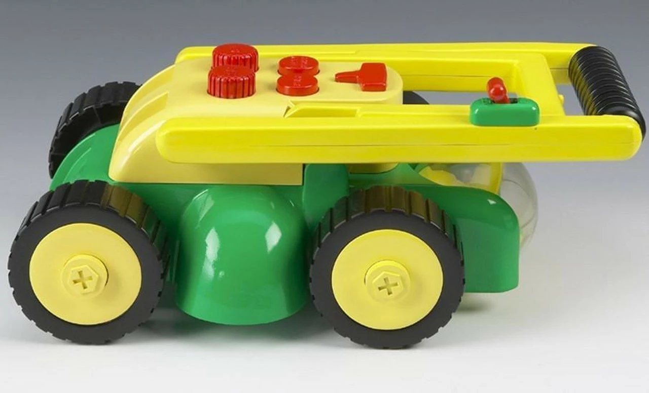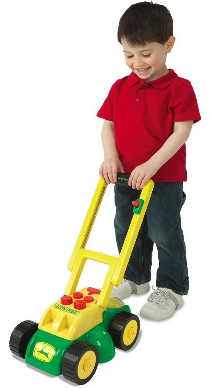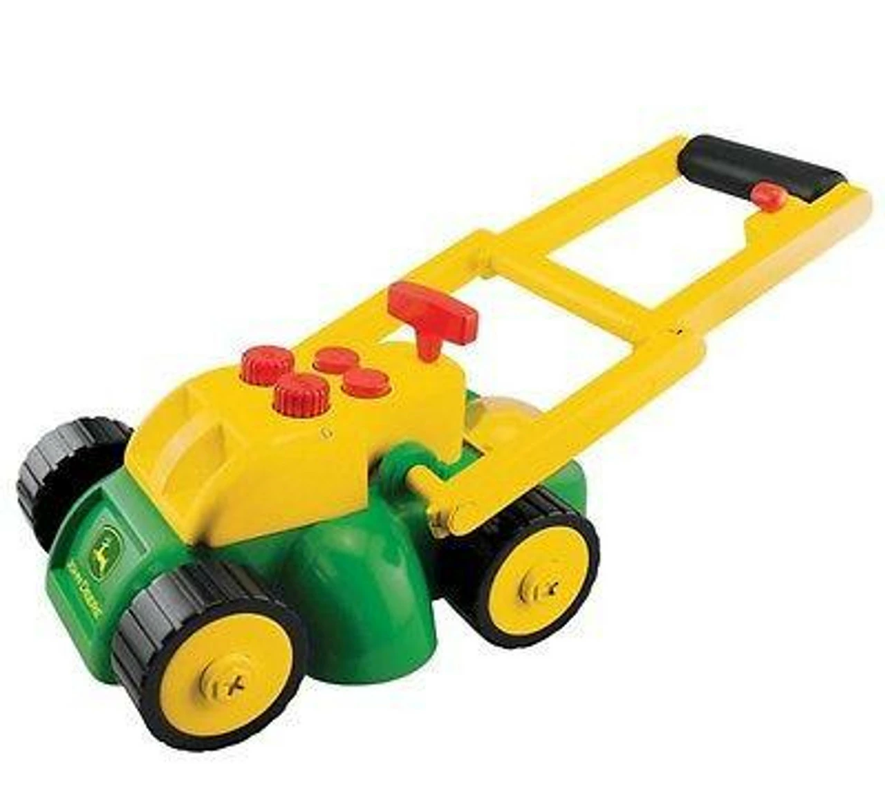 The John Deere Lawn Mower with real sounds lets your child get in on the action and help out around the yard. This lawn mower toy features a voice that prompts your child to check the oil and gas! Kids will love the realistic play watching the rotating grass clippings and spinning grass blade as they help out mom or dad with outdoor work! Button on the mower features its own unique sound. The extendable handle is sized right for your toddler and folds down so that the mower can store flat.