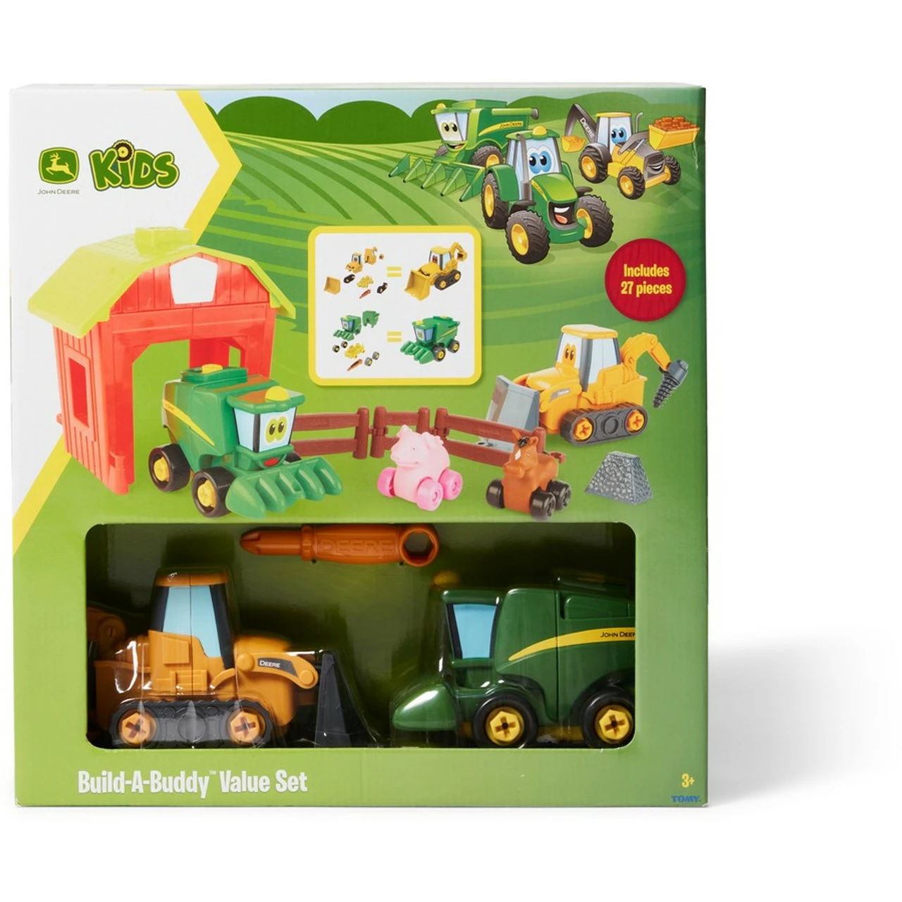The included tool makes it easy to screw and unscrew the screws to unbuild and build Corey the Combine as well as a big barn to store him in.Meanwhile, three fence pieces attach to the barn to create the perfect play space for the included horse and pig, each ready to roll with their own set of wheels!