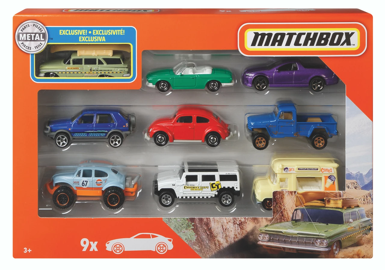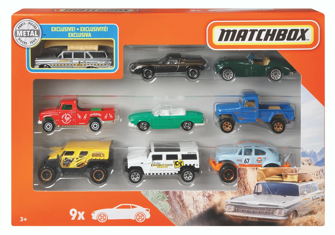 The gift pack assortment includes a variety of Matchbox™ metal vehicles to keep kids entertained! Each pack comes with an exclusive vehicle featuring decos you won’t find anywhere else in the entire Matchbox™ line! Nine stunning cars are in every set. Collect all the sets and showcase the ultimate fleet! Each pack sold separately, subject to availability. Not for use with some Matchbox™ sets. Colors and decorations may vary.