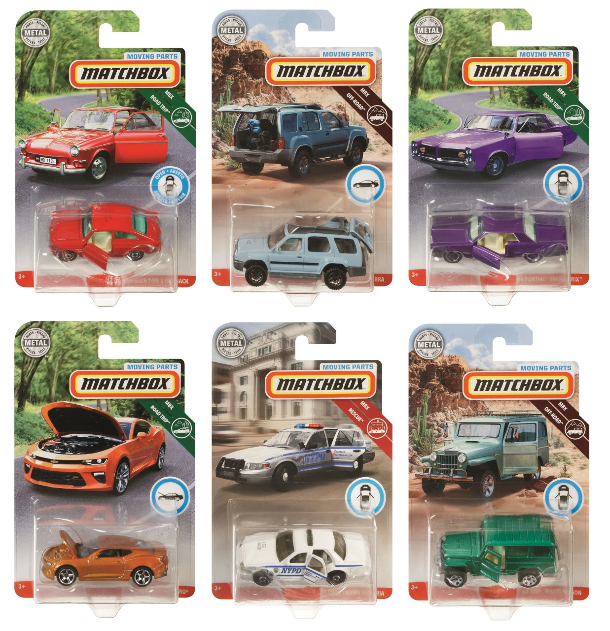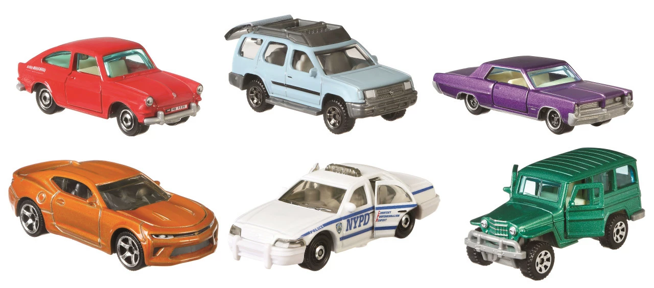 The Matchbox basic cars and trucks collection have a moving parts feature— doors, hoods and trunks open on a variety of popular vehicles from Ford, GM, Volkswagen, Nissan and more! There are six die-cast reproductions with exceptional true-to-life decos, the innovative moving part feature, and cool graphics on a blister pack. Great gift for new collectors who love small metal car play or want to start a collection.