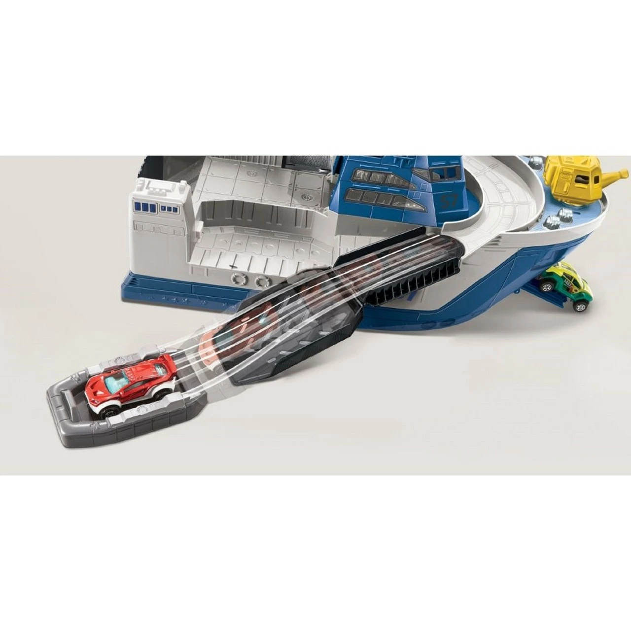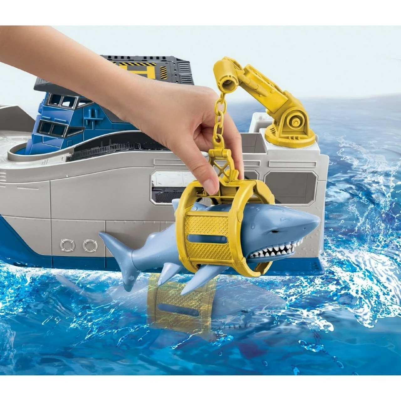 All aboard for high seas adventures with the Matchbox Rescue Response Team! There’s a sneaky shark on the loose and he’s snacking on Matchbox cars! Luckily this is no ordinary Shark Ship it floats in water and rolls on land so kids can keep the adventures going from the tabletop to the tub! Send the squirting helicopter ‘flying’ to distract the shark then use the water cannon to blast the shark and free the cars from his chomping jaws. Once the cars have raced to freedom, scoop the shark onto the ship by lowering the crane arm, swinging him onto the deck and sail off to release him far, far away. Kids will love playing out the heroic adventures of rescuing their cars from the giant shark. Includes one large-scale rolling and floating ship with a swinging/lowering crane arm; one car-chomping shark; two water-safe cars; one helicopter that doubles as a squeegee toy; one water cannon that mounts to front of the ship and one floating raft that launches from the boat and carries one car. Ages 3 and older. Not for use with some Matchbox sets. Colours and decorations may vary. Mega-sized ship floats in water and rolls on land for double the fun! Kids will love rescuing their cars from the sneaky car-chomping shark. The play continues from the tabletop to the tub. Includes a crane arm, chomping shark, helicopter toy, water cannon and floating raft. Comes with two water-safe Matchbox cars.