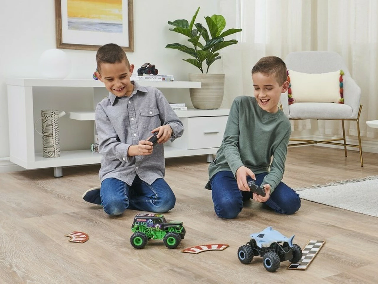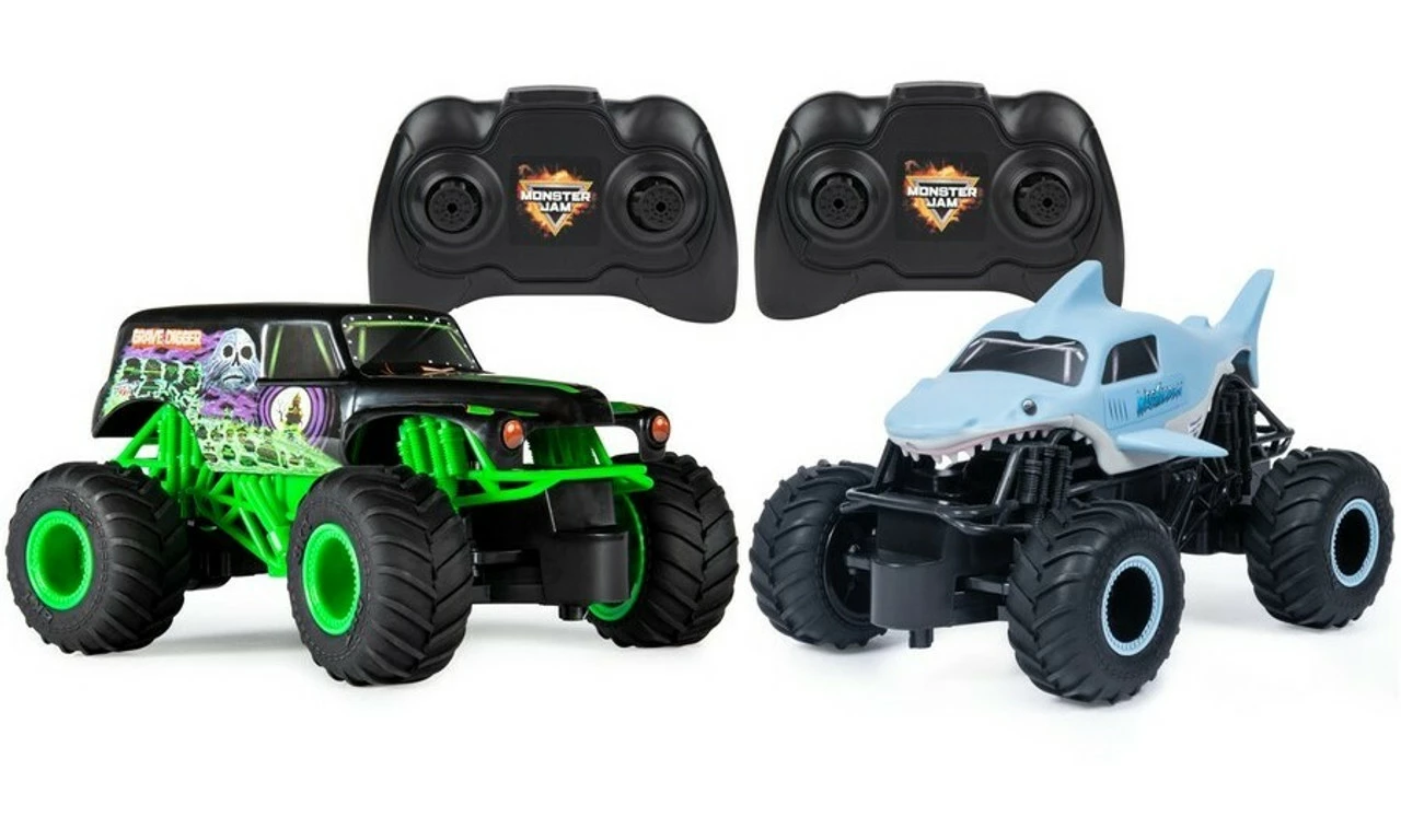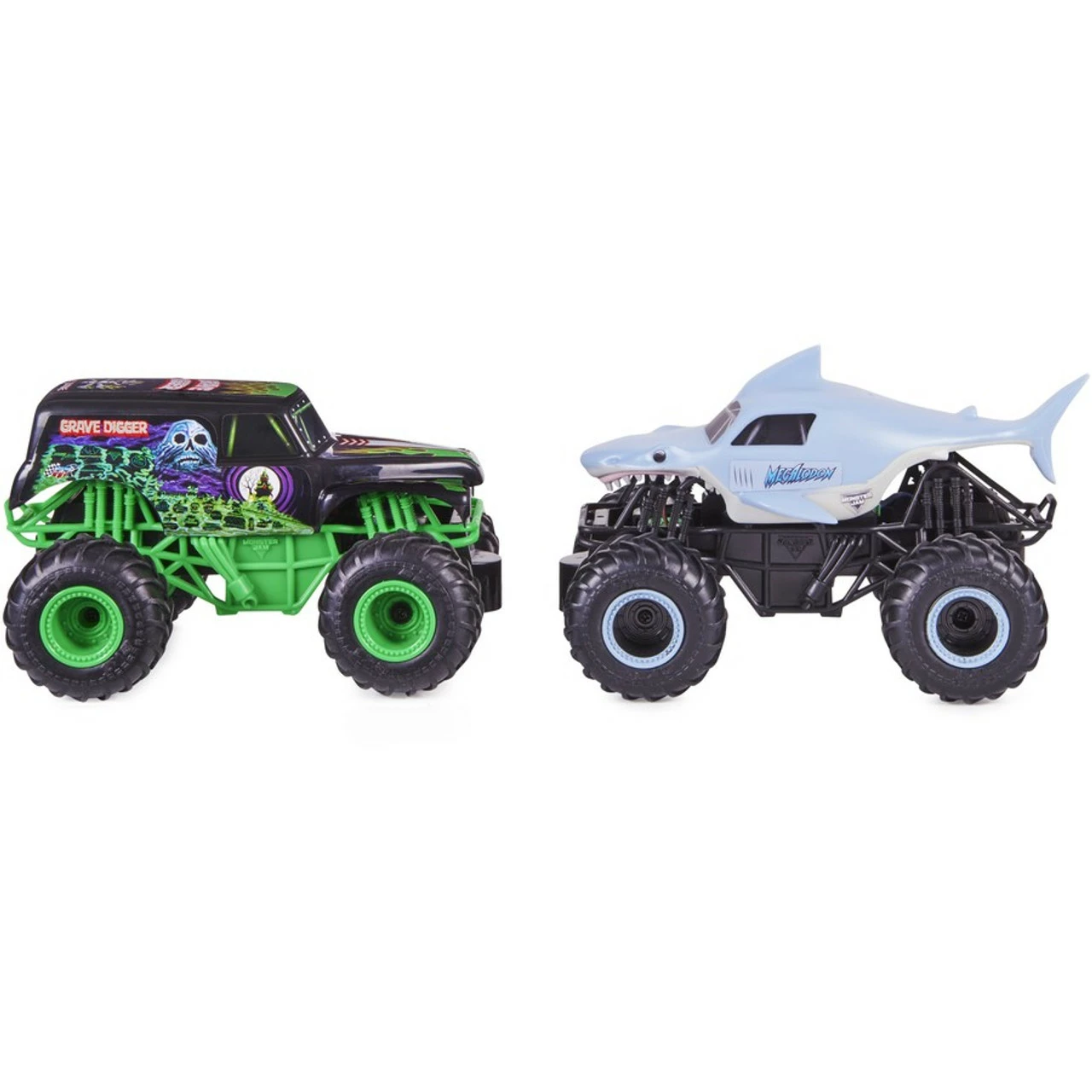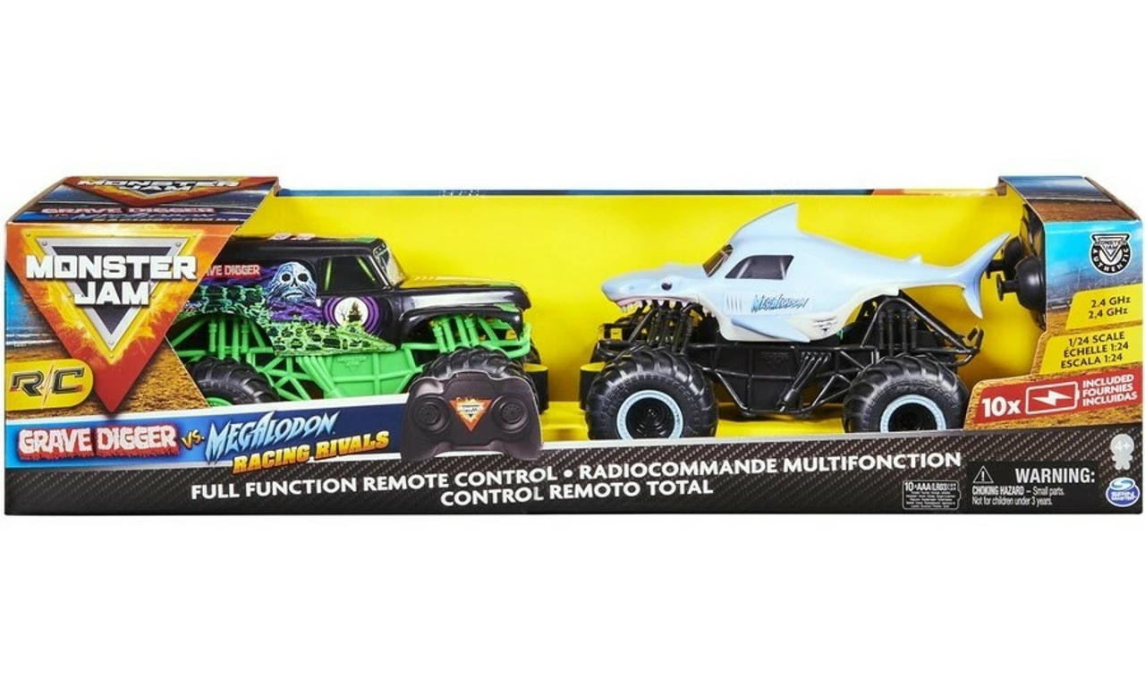 Race your favourite Monster Jam trucks head-to-head with the 1:24 scale Racing Rivals 2-Pack! This exclusive remote control set includes Grave Digger and Megalodon, plus eight track pieces and a start/finish line to create your own Monster Jam arena! Choose Grave Digger or Megalodon and race against your friends in an epic face-off! With two easy-to-use dual joystick controllers and 10 AAA batteries included, you can control your Monster Jam RC trucks from up to 200 feet away and roll right out of the box! Featuring authentic Monster Jam styling, official BKT tires and look-alike chassis, the 1:24 scale Grave Digger and Megalodon always deliver big fun! Race and perform awesome stunts, crazy crashes and brutal bashes! Host your very own Monster Jam rally and bring the action home with the all-new, official 1:24 scale remote control Racing Rivals 2-Pack!