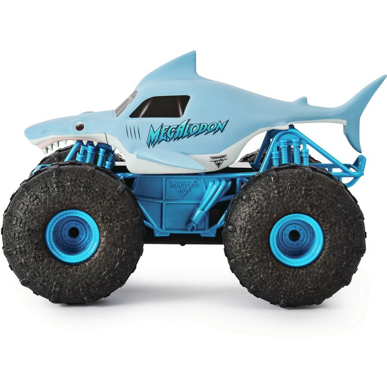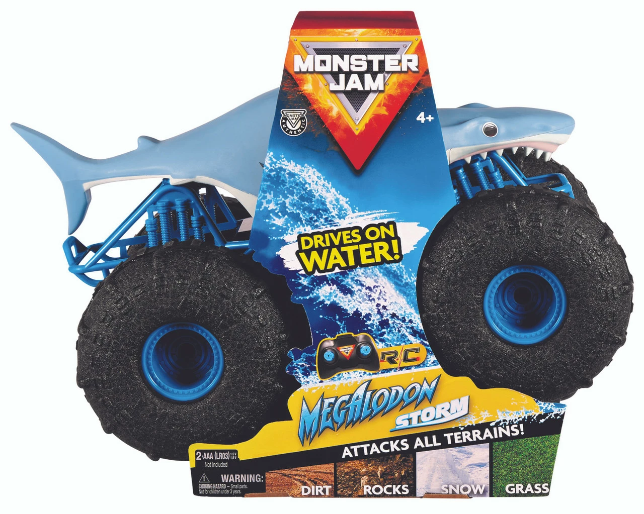 The Monster Jam Megalodon Storm Thrasher Remote Control Monster Truck is an all-terrain truck ready to race on land or water. Take on any terrain, from snow and mud to rocks and grass.