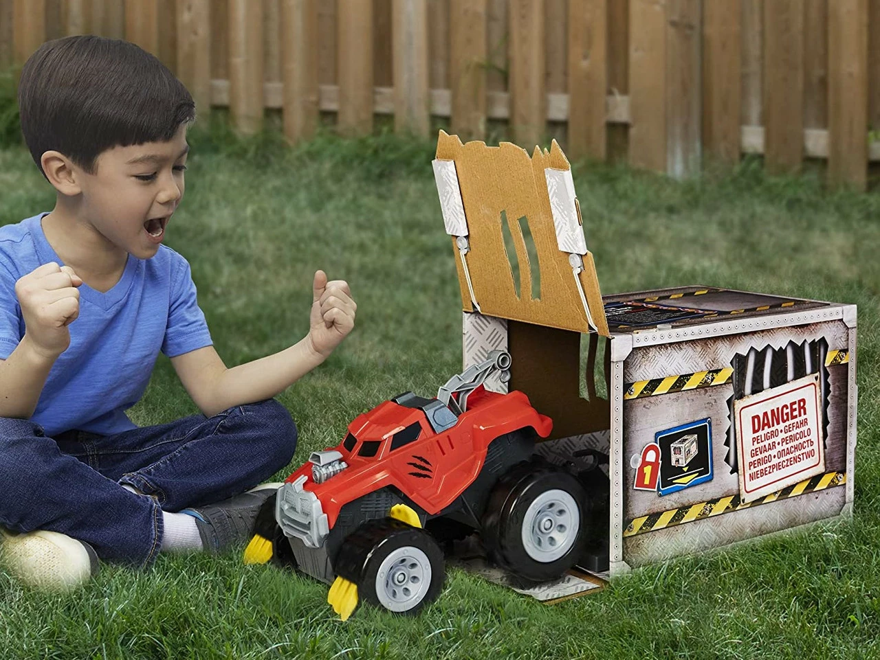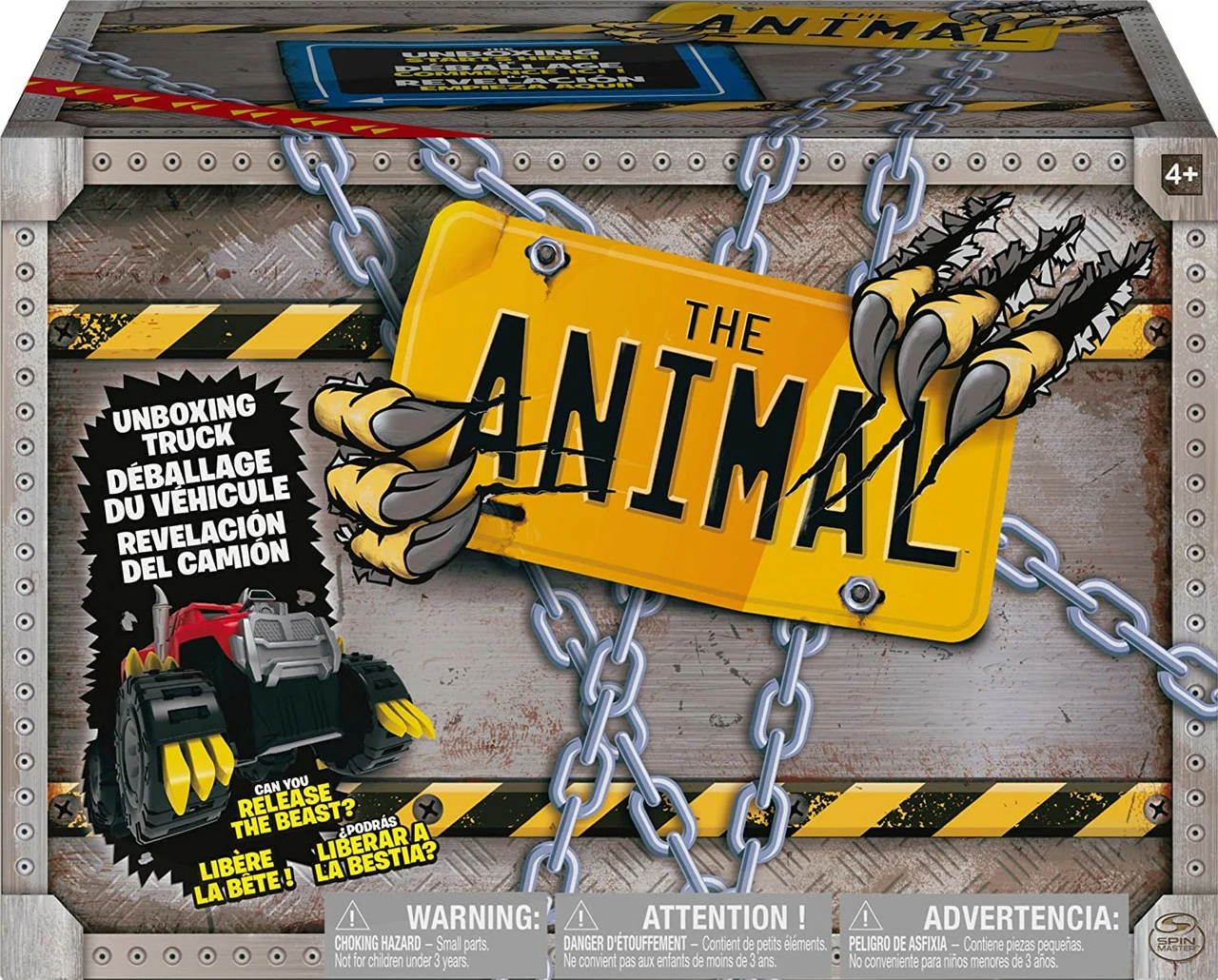 Can you release the beast? The Animal is a powerful interactive truck that breaks out of its own package! The ultimate unboxing experience begins when you tear off the outer layer of the package and pull the tab to reveal the key. Unlock the crate and awaken The Animal inside! It’s up to you to make The Animal angry enough to claw out. Yell and it will roar back! Knock and it will knock back – The Animal is listening! Continue to knock and yell and watch the crate start to shake back and forth as The Animal comes alive with glowing eyes and sounds! Aggravate The Animal until it transforms from powerful 4X4 truck to beast, clawing its way out of the crate! Once The Animal unboxes, it’s ready for clawing and climbing action. Retractable claws hidden in the wheels allow The Animal to claw and climb over obstacles and power over different terrains! Challenge The Animal to claw its way over objects up to 3 inches tall! Out of the crate, The Animal is easy to use. Switch the throttle to forward or reverse position and push the motor down to watch it move! To make The Animal stop, simply push the motor again or push the tow lever. For more fun ways to play with The Animal, use the included tow strap to pull another toy, or switch to reverse and test The Animal’s strength with a game of tug of war! Discover all the ways The Animal will interact with you. Shake your truck to make it angry, knock or yell at it to make it growl, or put The Animal on its side to see and hear it whine! Repeat the unboxing and watch The Animal claw out of its crate over and over again! The Animal is a great gift for kids aged 4 and up and can be used indoors or outdoors. The Animal is powered by 4 Duracell AA batteries (included). The Animal is the ultimate unboxing truck that can claw and climb over anything in its way – including its own box! Claw through any challenge with The Animal!