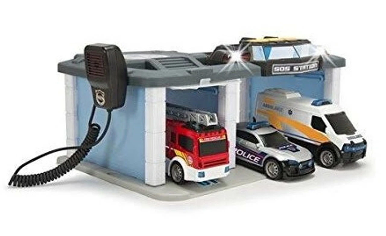 Rescue Center: all the helpers under one roof The Dickie Toys Rescue Center is the ultimate gift idea for all fans of rescue vehicles. The rescue station easily accommodates the three free-wheeling vehicles. The fire engine, police car and ambulance ensure that every call for help in the toy town can be answered. And speaking of answering, the station has a microphone with a loudspeaker function, so that operation leaders aged three years and upwards can issue the correct commands. In addition, the doors can be opened and the station also has light and sound effects. For the ultimate in gaming fun, all that needs to be done is to insert the included batteries.