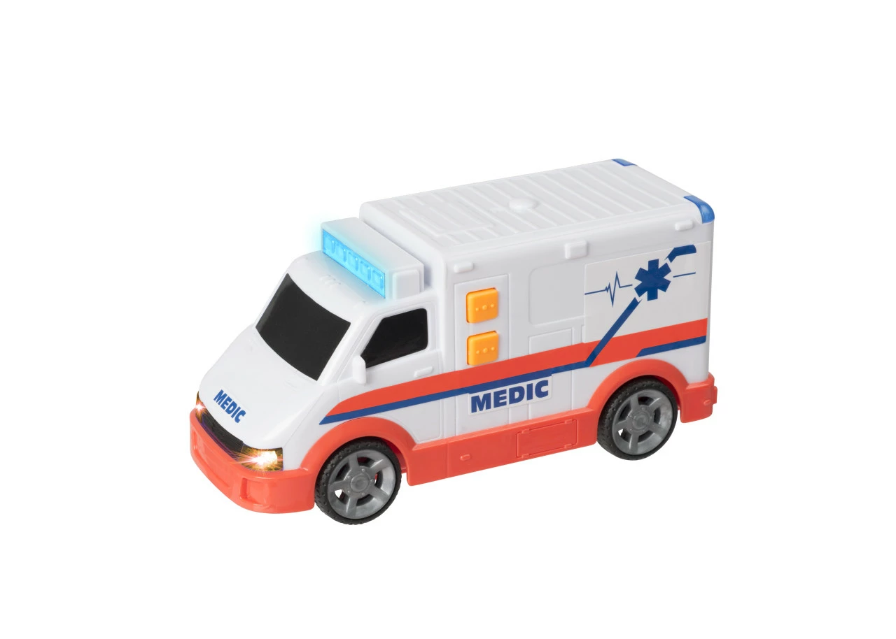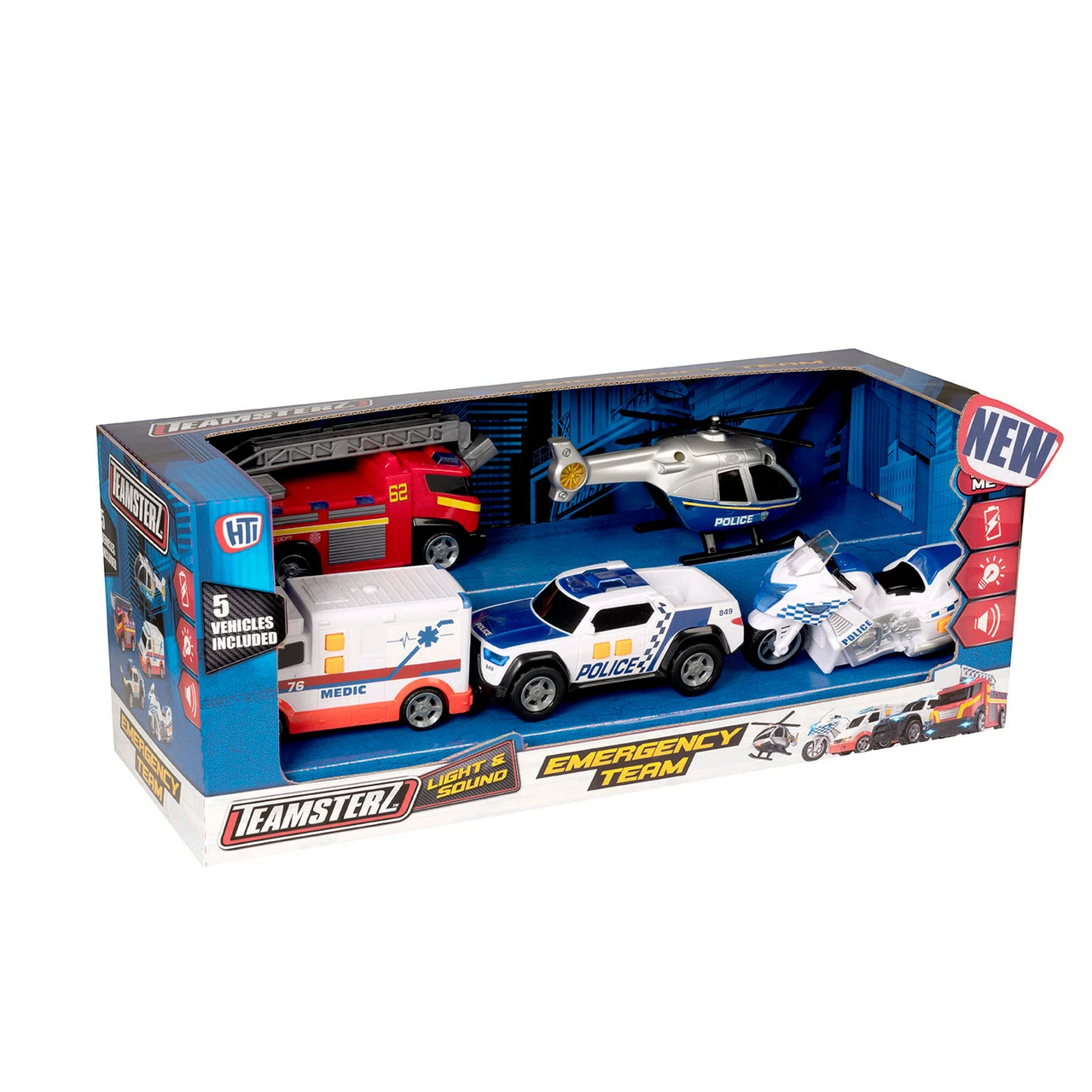 Race to the rescue of any make-believe emergency with the Teamsterz Light & Sound Emergency Team! There are 5 different free-wheeling vehicles within the set to encourage learning through play, including; a light & sound ambulance, police car and police motorbike as well as a non-light & sound fire engine and helicopter! The light & sound vehicles feature emergency blue flashing lights, siren sounds and realistic engine sounds. The helicopter features free-moving rotor blades and the fire engine’s ladder is fully extendable and rotates 360 degrees. The perfect gift for any enthusiastic driver, offering hours of imaginative fun! Aiding the development of your little one?s social skills, imagination and fine motor skills as the free-wheeling vehicles are the perfect size for push along play. Suitable for ages 3+.