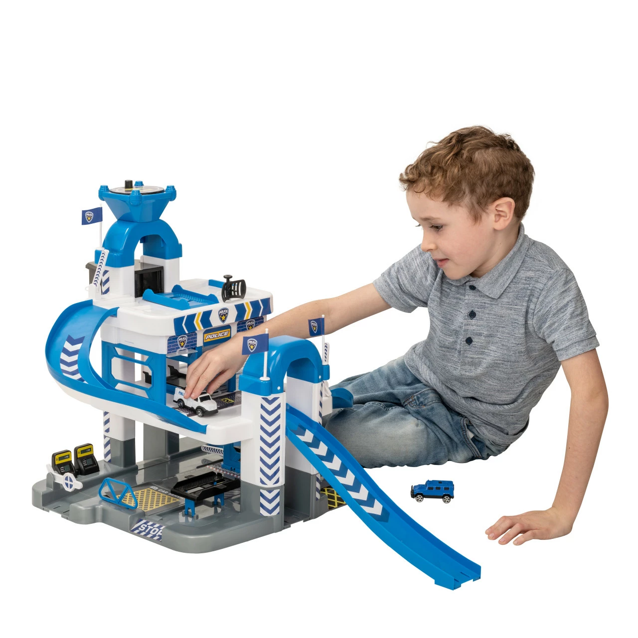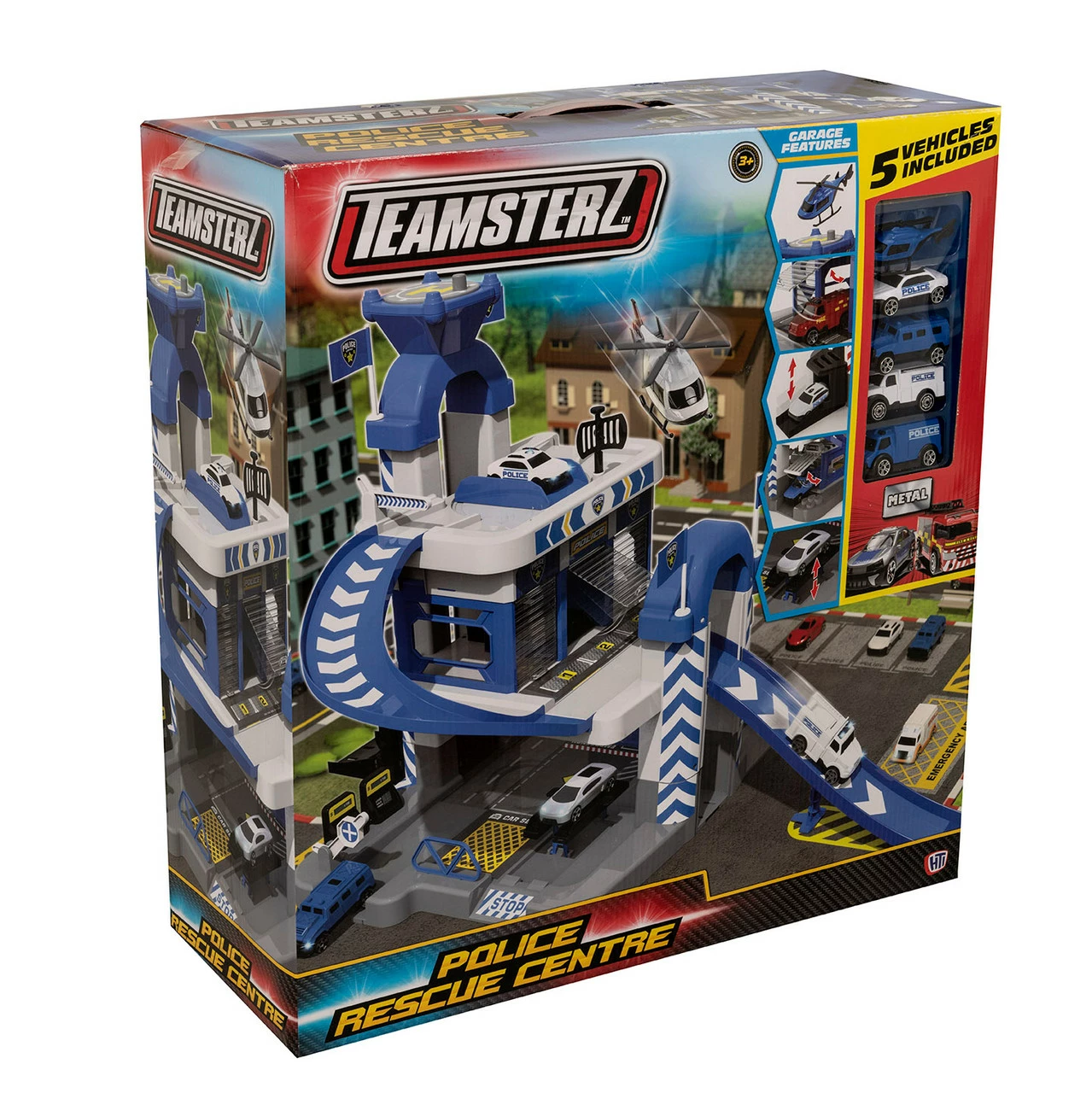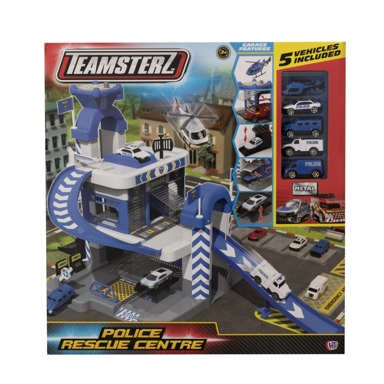 Protect your city and save lives with the Teamsterz Police Rescue Centre with 3 cars. This 3-level toy garage playset is packed with features including a manually operated tip launcher and speed response ramp, connecting ramps between levels, helipad, petrol pumps, inspection ramp, working lift and jail. The 3 Teamsterz vehicles included are approximately 3-inch scale and feature a high-quality die-cast body shell and independent free moving wheels. Compatible with both 3-inch and 4-inch toy cars, this toy rescue playset can also be connected to Teamsterz track sets for broader play. The Teamsterz Police Rescue Centre with 3 toy cars will provide hours of imaginative fun. Suitable for ages 3 years +.