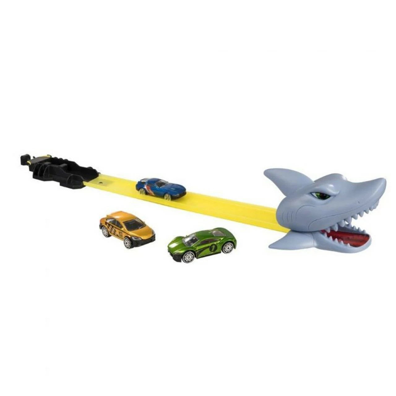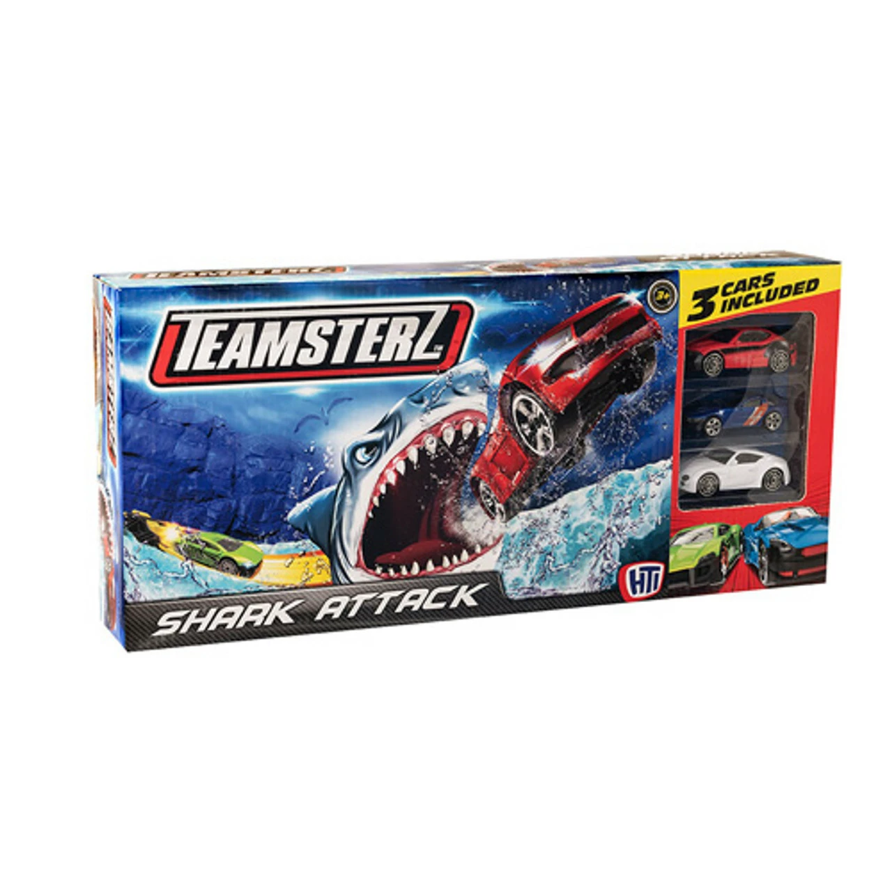 Escape the sharks open jaws! Launch your car and race down the track to jump through the sharp-toothed jaws of the shark! The Teamsterz Shark Attack Track Set features a pull-back elastic launcher and single lane race track with shark head jump! This great value track set is easy to construct and comes with 3 x die-cast cars for immediate play! The perfect gift for any enthusiastic little racer, offering hours of imaginative fun! The track set is compatible with other Teamsterz playsets and die-cast vehicles for broader play. The Teamsterz die-cast vehicles included are approximately 3 inch scale and feature a high quality die-cast body shell and independent free moving wheels. Suitable for ages 3+.