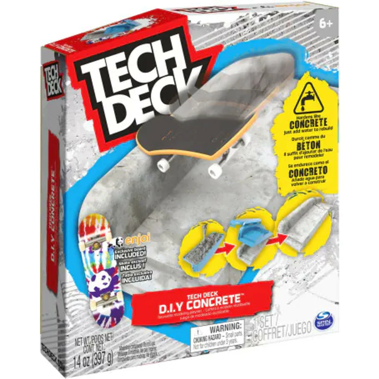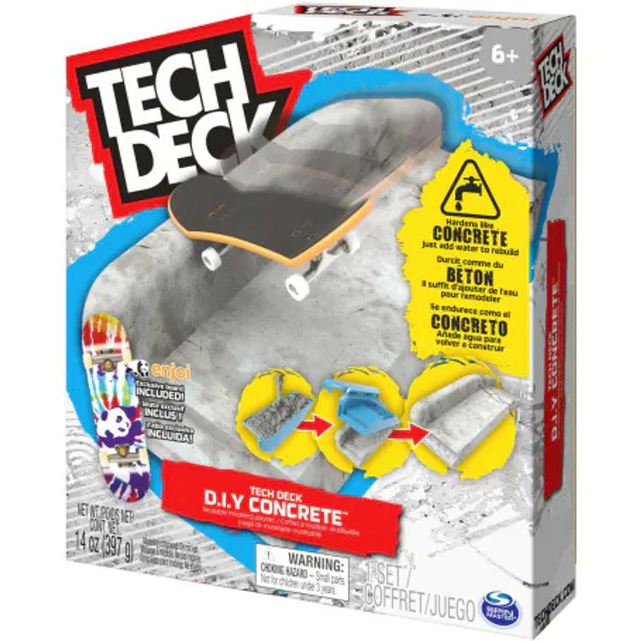 Build your own fingerboard obstacle course with the Tech Deck DIY Concrete Reusable Modelling skatepark! This set comes with everything you need to create your own ramps and rails, including 14oz of reusable concrete compound, ramp and rail moulds, a moulding tool, and an exclusive Enjoi Fingerboard! The DIY concrete is easy to use and reuse. Wet it, set it and shred it! Simply add water, let it sit for 6-8 hours, and your creation will harden just like concrete. Use the moulds to create perfect ramps or create your own fingerboard obstacles to level up your skill. Simply add water to create new challenges. Challenge your friends, develop your skills, and build your Tech Deck collection. Tech Deck fingerboards are for skate-lovers ages 6 and up. Create your own obstacles with the Tech Deck DIY Concrete Reusable Modelling Playset!