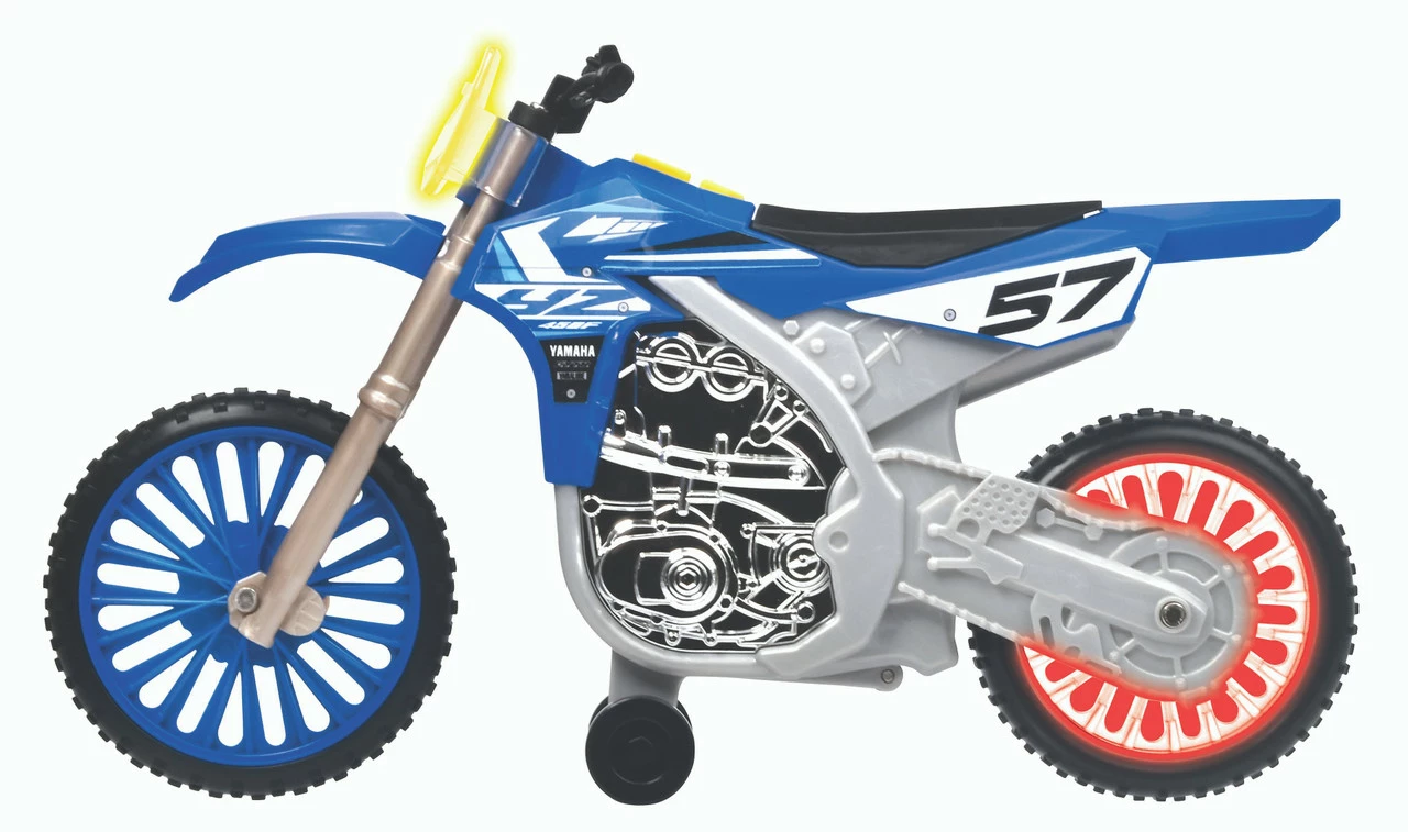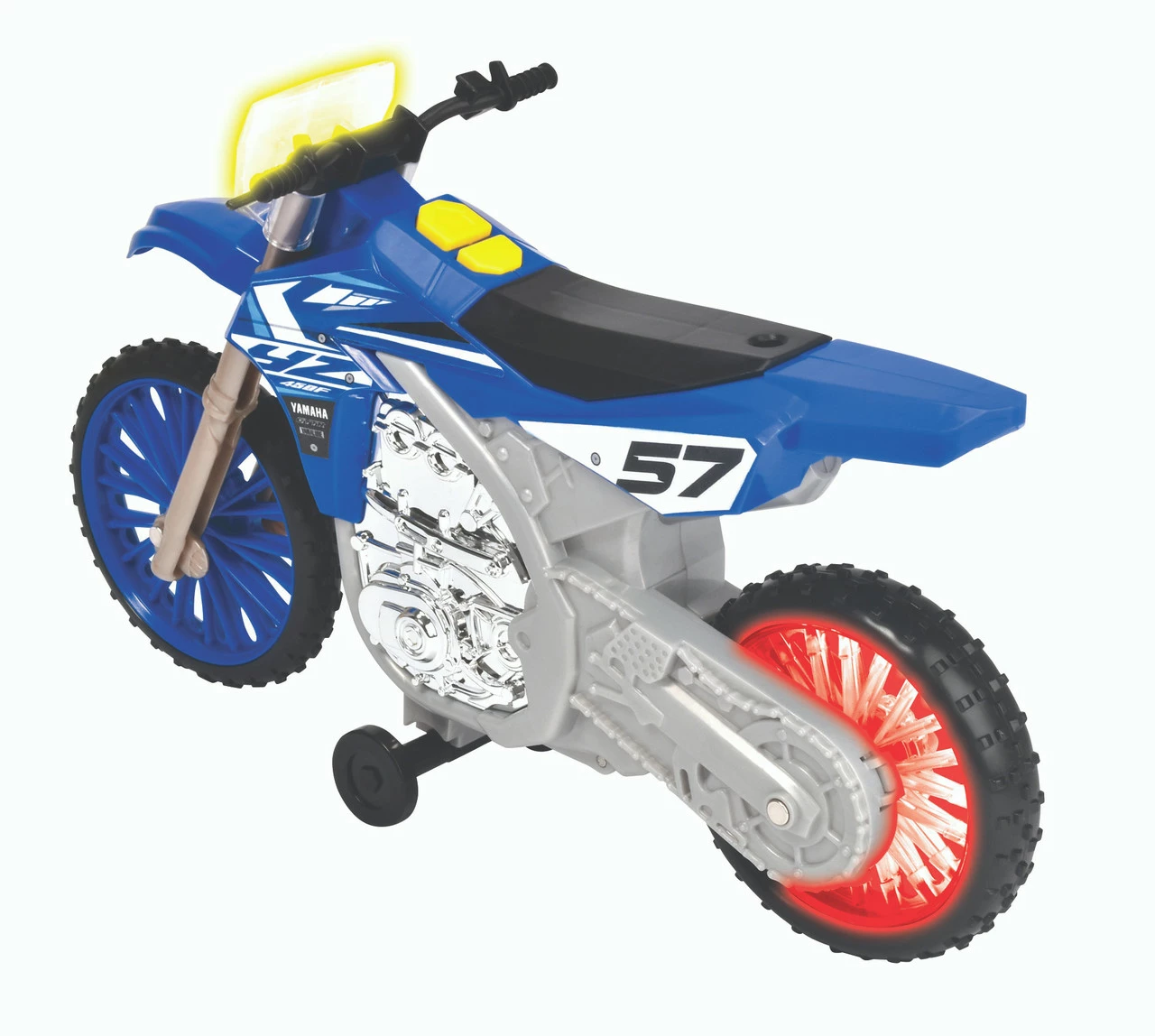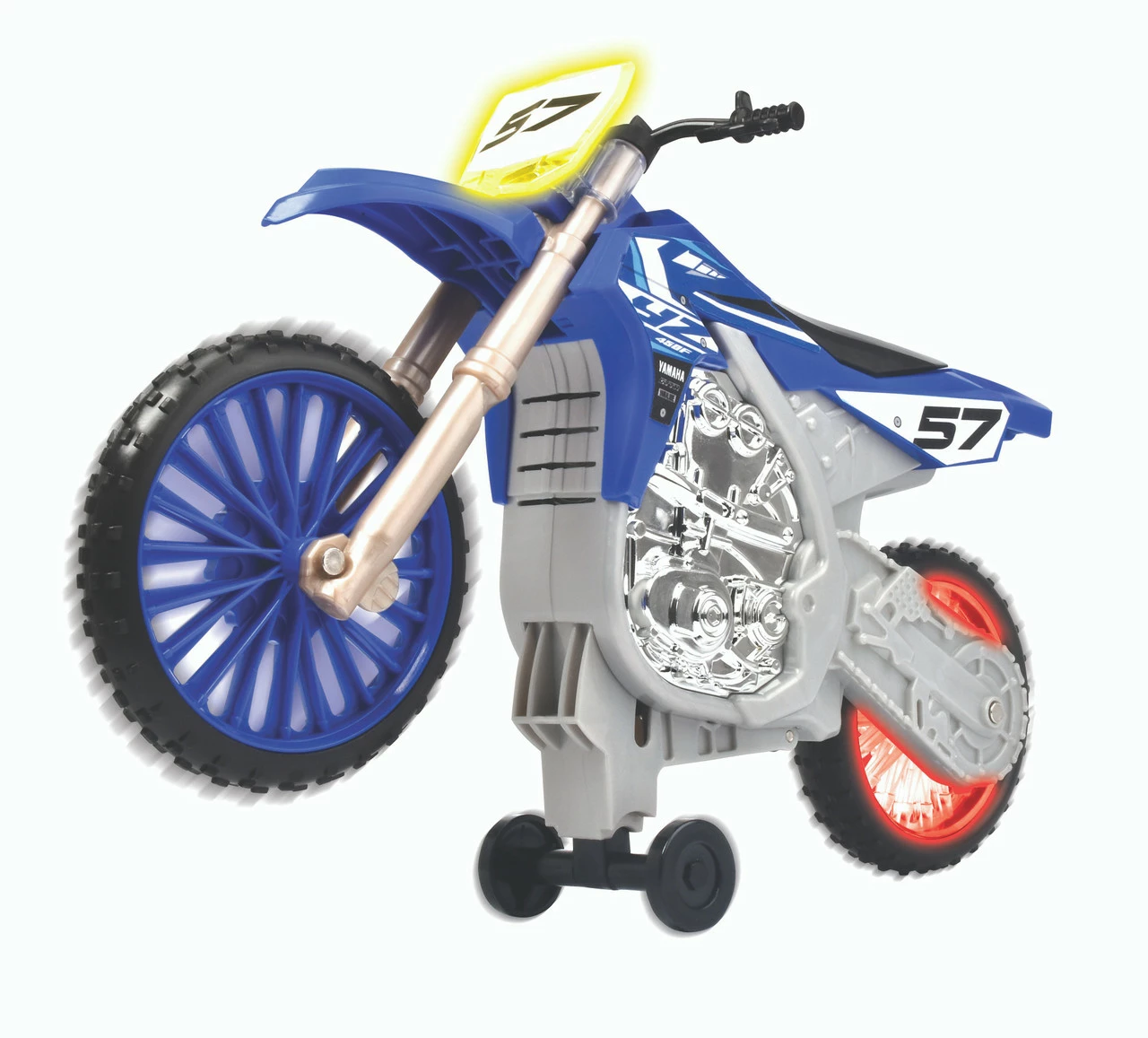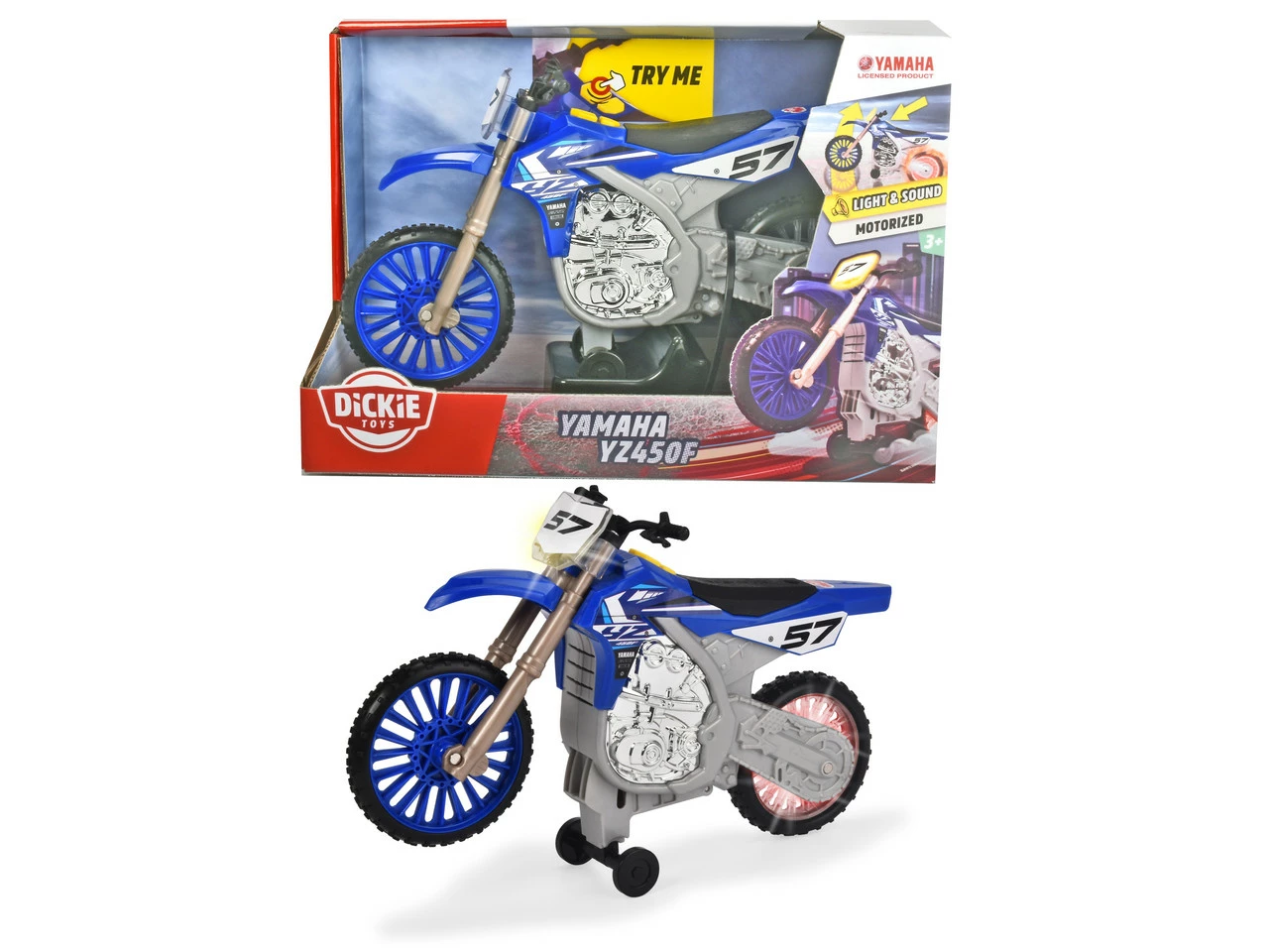 motorized for forward drive and wheelie function,light sound, Try Me, 26 cm, TB, blue Dickie Toys Yamaha YZ: Fun guaranteed! The Dickie Toys Yamaha YZ from the Wheelie Raiders series comes with a number of exciting features. The motorized toy motorbike travels forwards at the touch of a button and does a wheelie. It also features light and sound effects and is designed for children aged 3 and above. With a detailed motocross design based on an original Yamaha license, this new item from Dickie Toys makes an ideal gift for young motor sports fans. Name: Yamaha YZ Wheelie Raiders Toy motorbike with motorised design Travel forwards and does a wheelie at the touch of a button Light and sound effects Motocross design Batteries included License: Yamaha Length: 26 cm Recommended age: 3 and above
